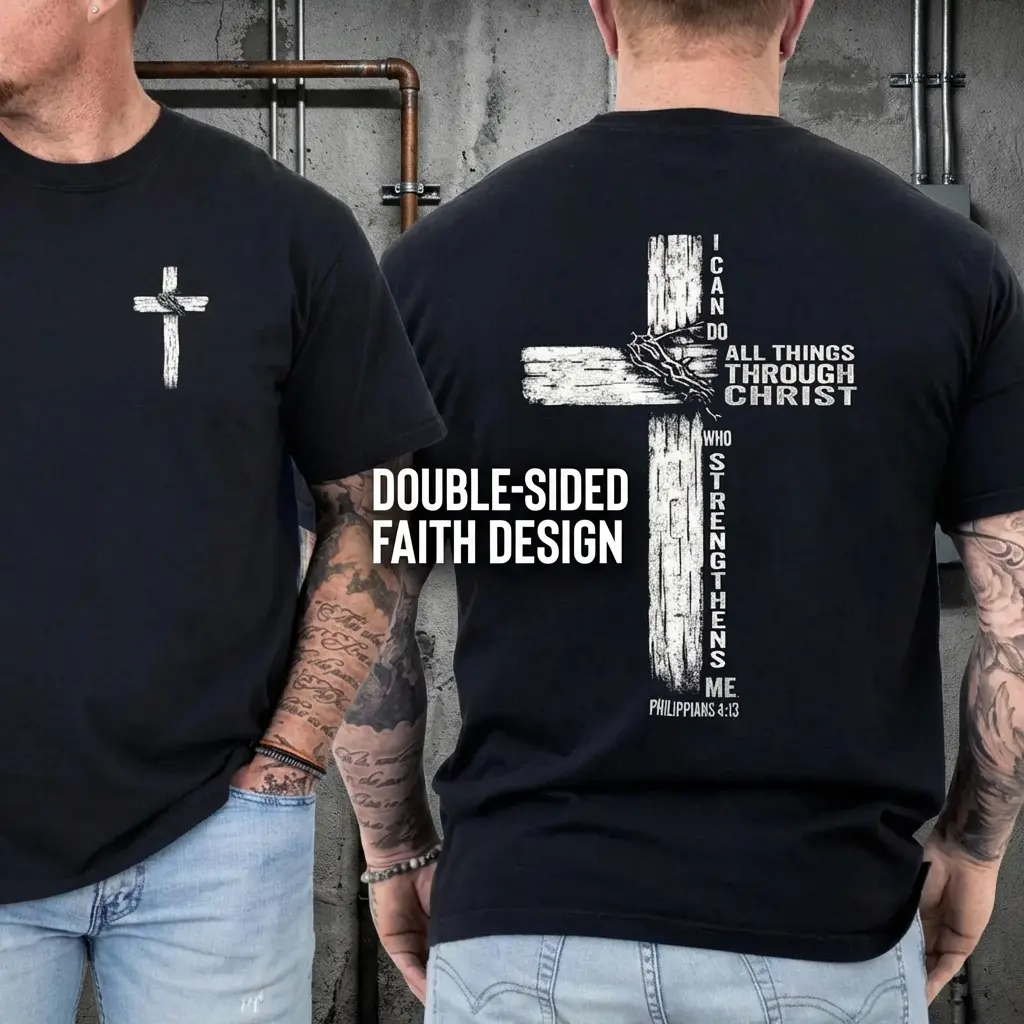Double Sided Faith Quote Washed T-Shirt – Philippians 4:13 Christian Cross Graphic Tee Sports T-shirt, regular fit, casual and stylish T-shirt, suitable for everyday wear, a men's top suitable for all seasons.