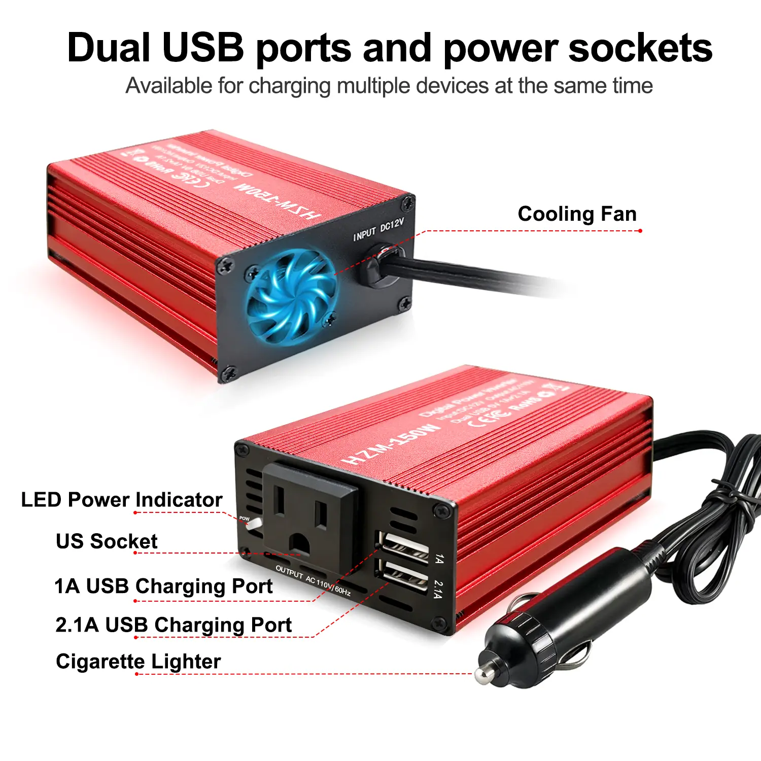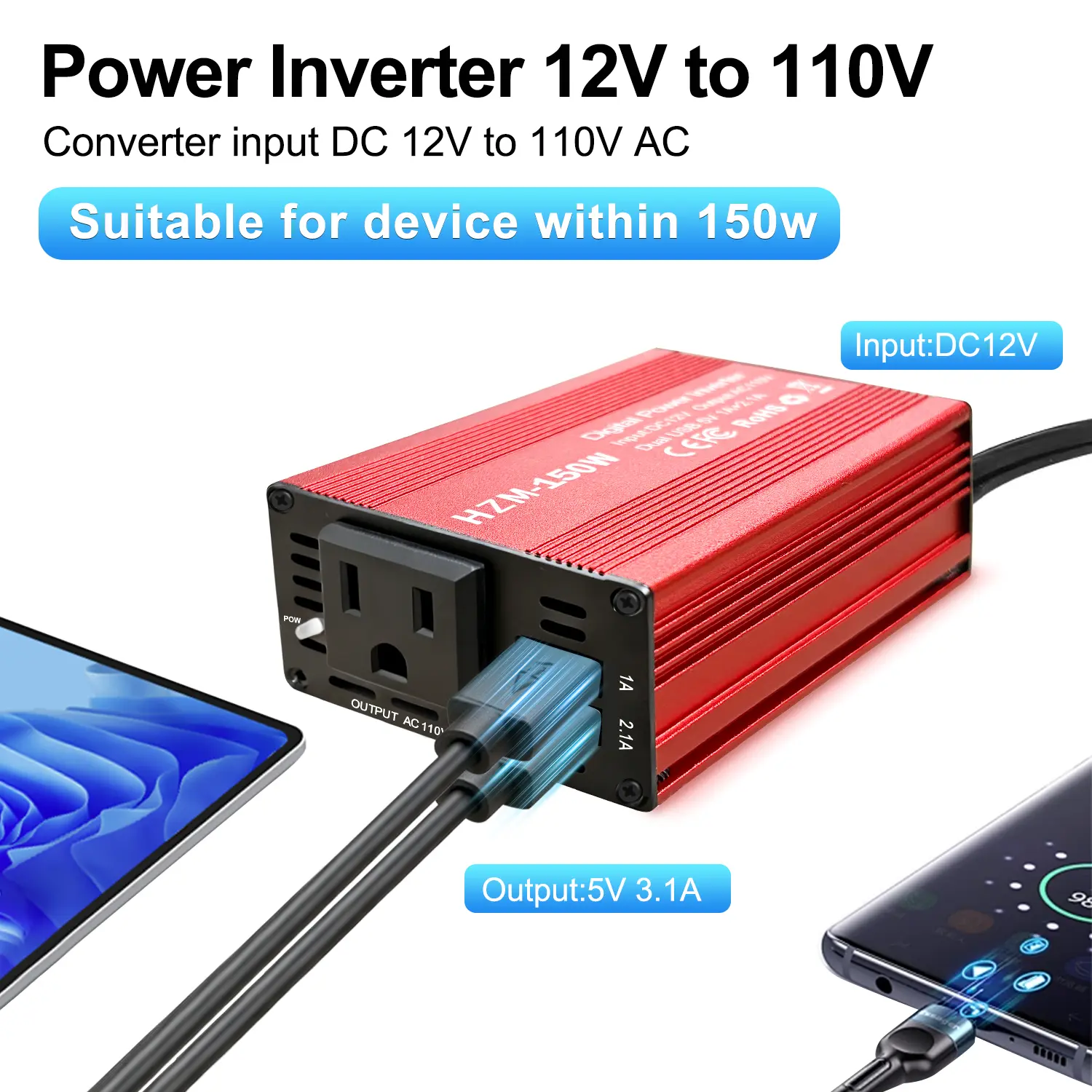 5. Artblepro 150W Car Power Inverter Portable 12V DC to 110V AC Converter Vehicle Adapter Plug Outlet with 3.1A Dual USB Car Charger for Laptop Computer (Classic Red)