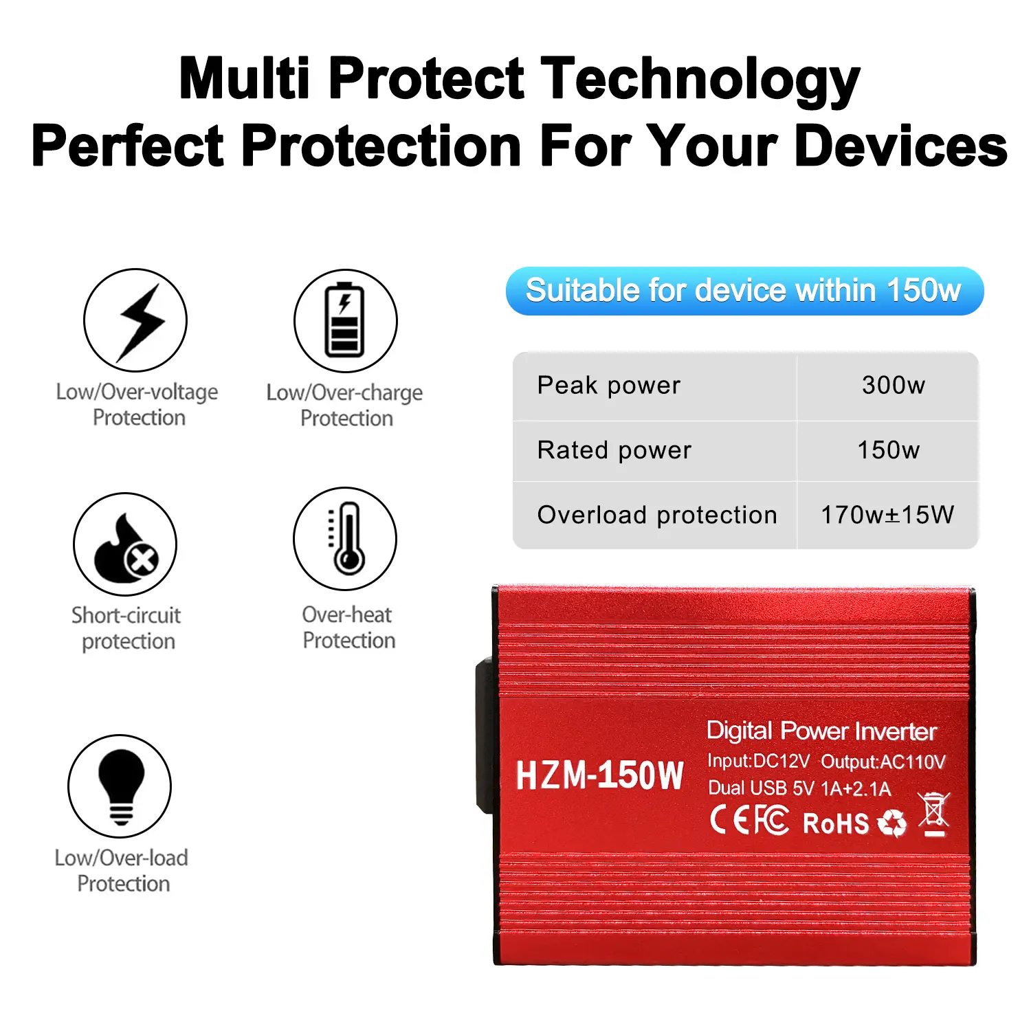 ·Premium 150w car power inverter: Plug in the car cigarette lighter, offering 150 Watts of continuous 12V DC to 110V AC power output, this car adapter for plug outlet equipped with 2 USB ports and 1 AC outlets, easy charging multi charging devices in the vehicle.