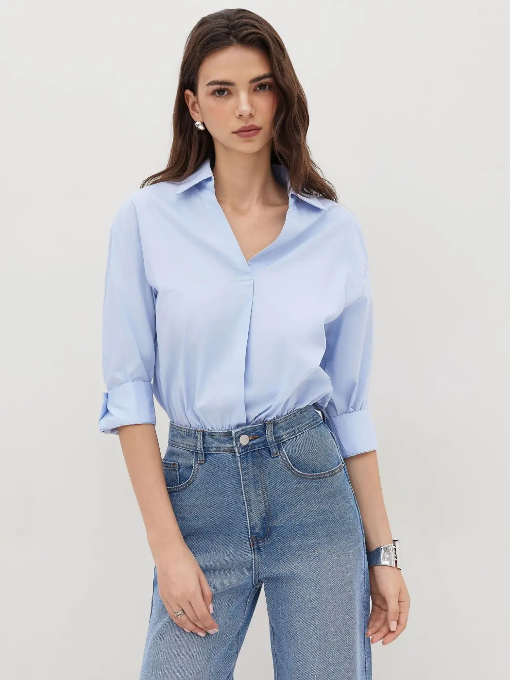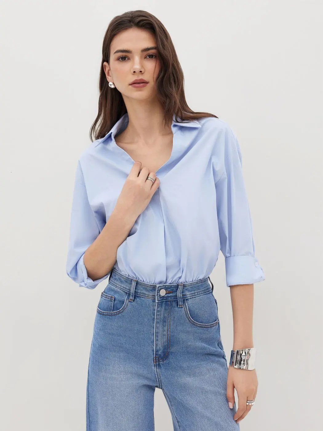 Women’s Cotton Shirt Bodysuit – Collared Button Up Top with Roll Up Sleeves
