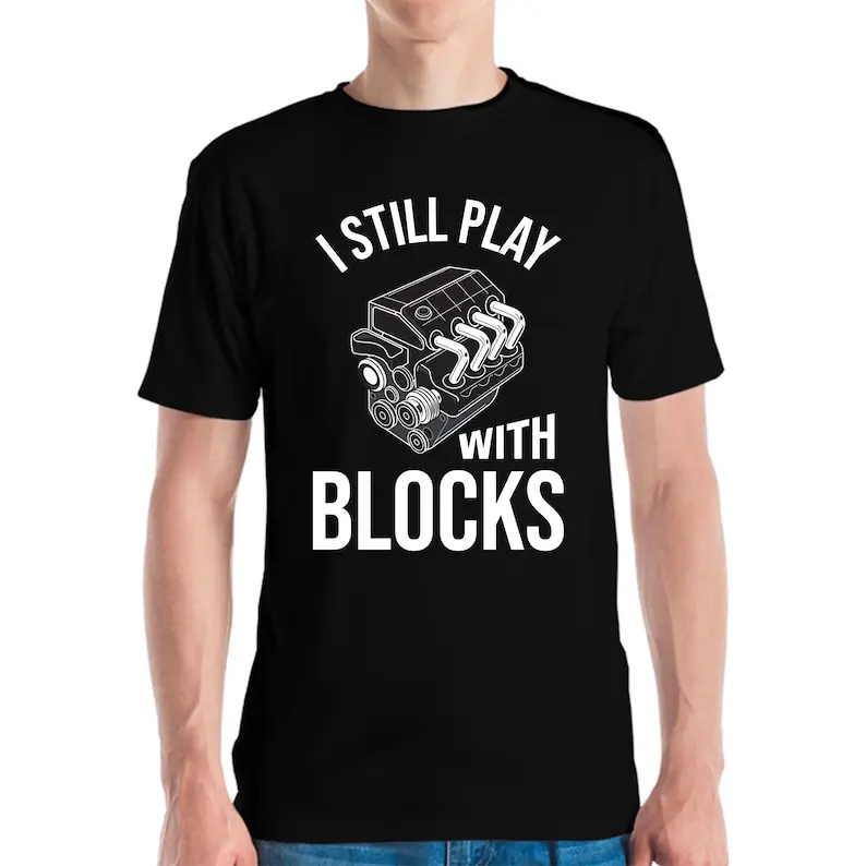 Funny Mens I Still Play with Blocks Engine Block Mechanic Cylinder Fathers Day T-Shirt