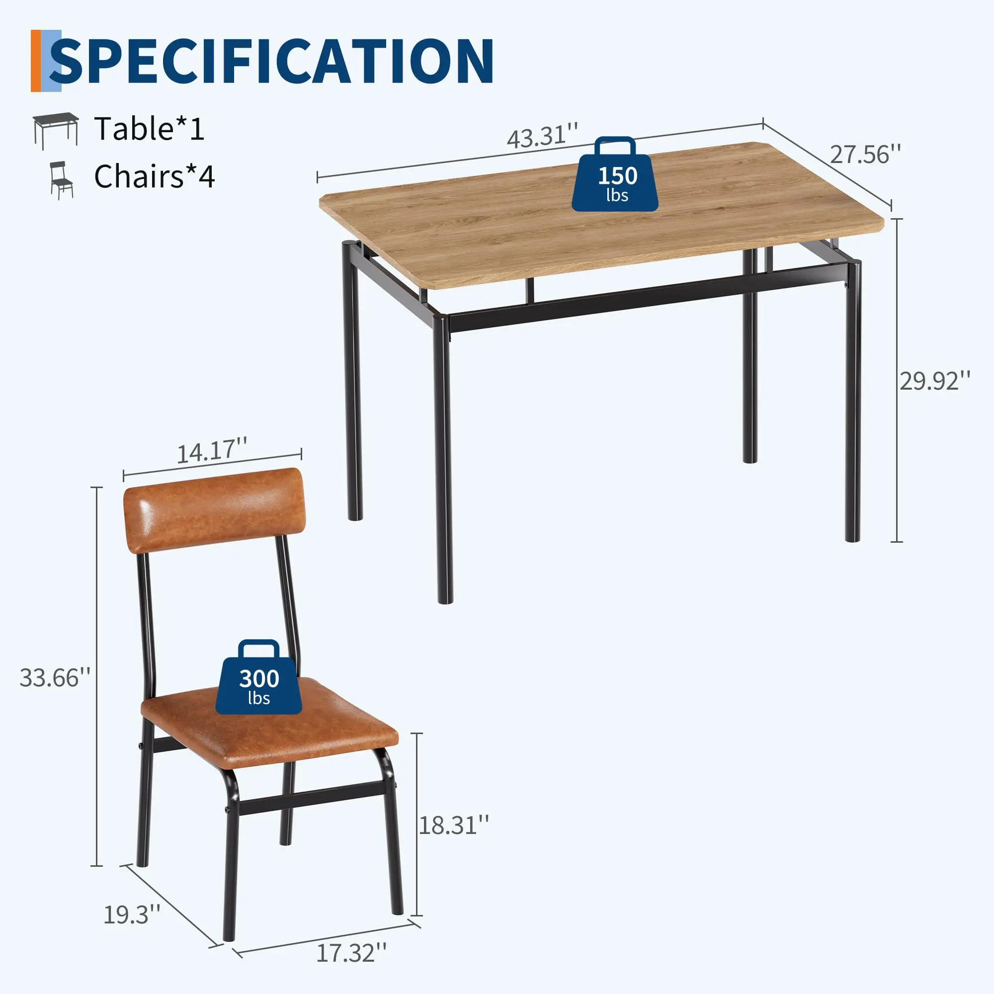 · 🥯【Exceptional Durability for Daily Living】Crafted from premium MDF board and supported by a robust metal frame, this 5-piece dining table set is built to last. Enjoy reliable strength and stability meal after meal, making it the perfect choice for your dining room, apartment. CHAIR WEIGHT CAPACITY: 300 LBS. TABLE WEIGHT CAPACITY: 150 LBS.