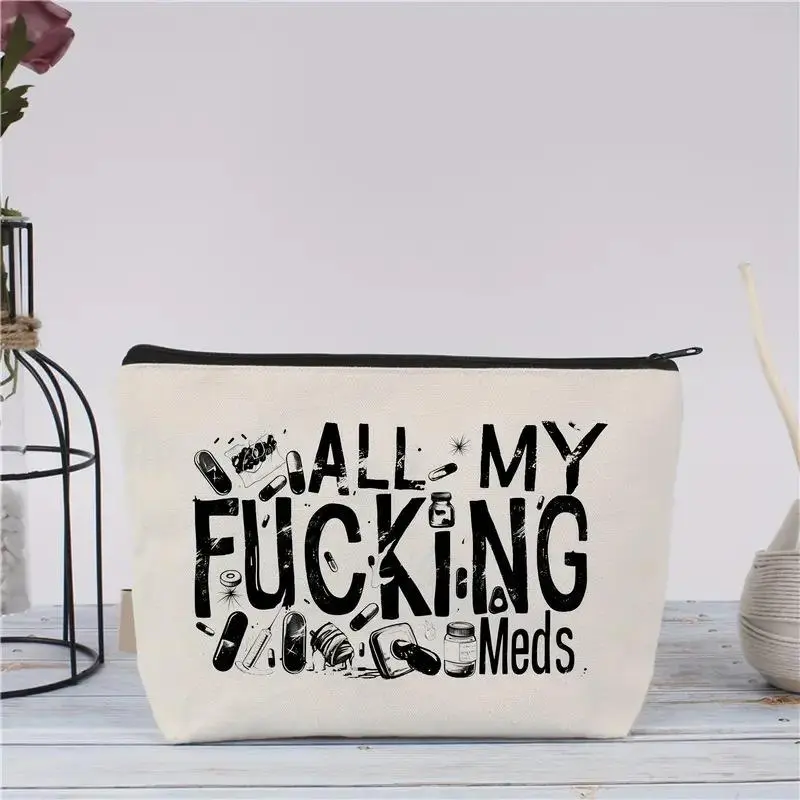 All My Meds Letter Pattern Canvas Makeup Bag, 1/6/16pcs Reusable Zipper Makeup Organizer, Travel and Makeup Pill Storage Bag, Travel Cosmetic Bags, Perfect Gifts for Women