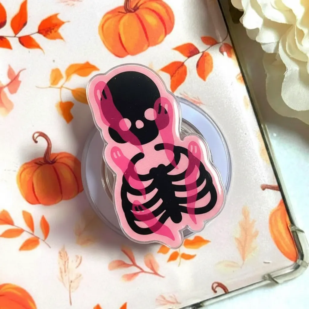 Pink Skeleton Halloween Phone Grip, Cute Vinyl Ghost MagSafe Holder, Aesthetic Pink Spooky Griptok, Unique Halloween Gift for Journaling & Readers
