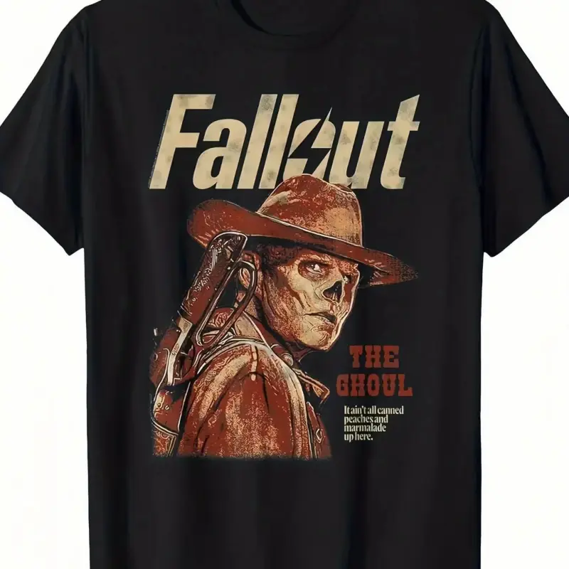 Fallout Inspired Black Graphic T-Shirt - Vintage Style 'The Ghoul' Design Featuring Skull Face Character with Cowboy Hat, Post-Apocalyptic Aesthetic for Gaming Enthusiasts