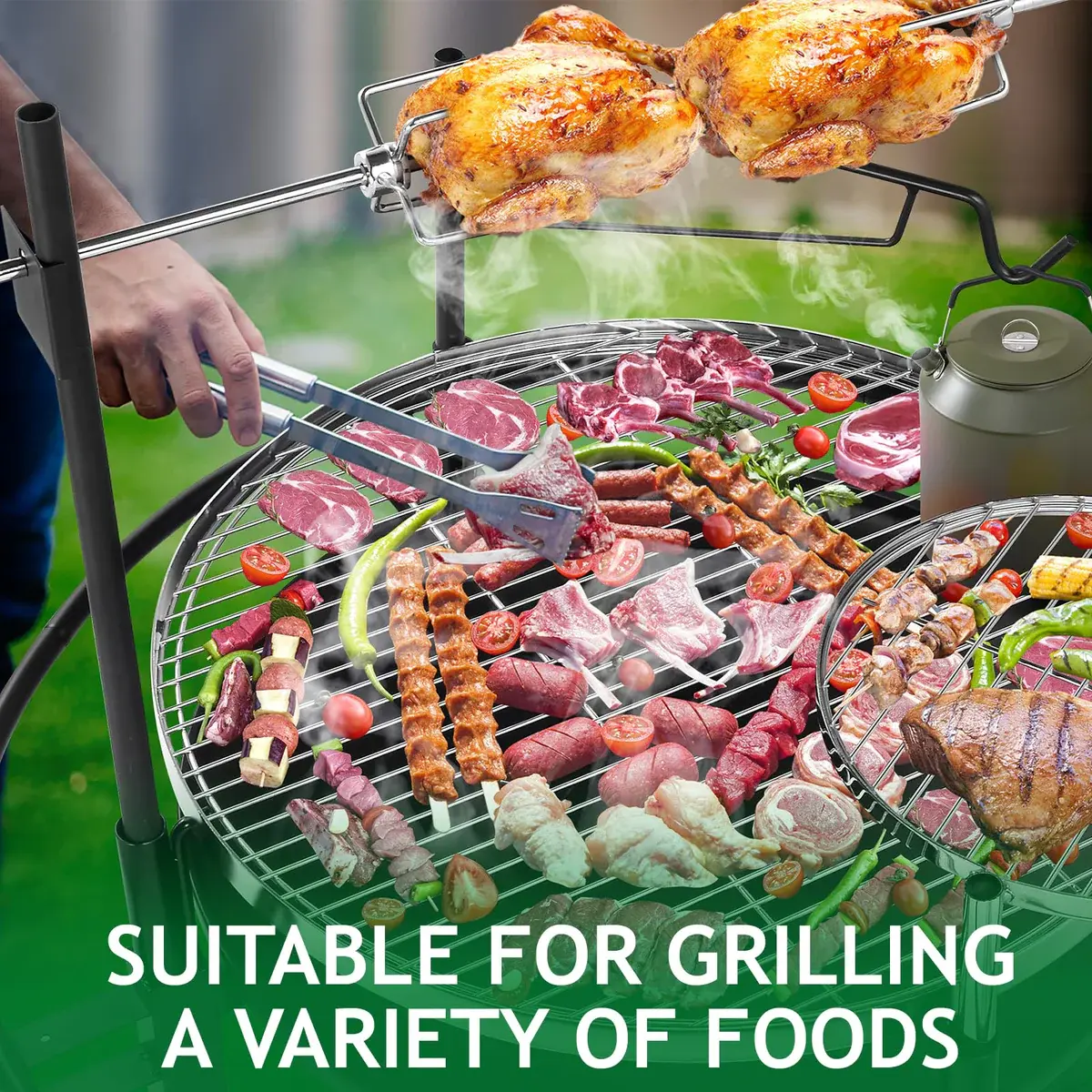 2. Multi Functional Design: Two rotating cooking grates with different heights. The grill can be adjusted up and down and fixed in place by a lock pin for safety. One can be used for baking food such as meat, vegetables or marshmallows, while the other can be used for heat preservation.