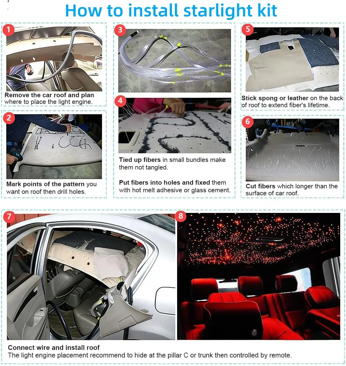 · 16W high power small size Light Engine, easier to hide while providing higher brightness light effect for your car. Equipped with 500pcs*0.75mn*3m/9.8ft end grow fiber optic made of PMMA plastic, soft and easy to bend, high light energy utilization, no heat, no conductivity, waterproof and safe.