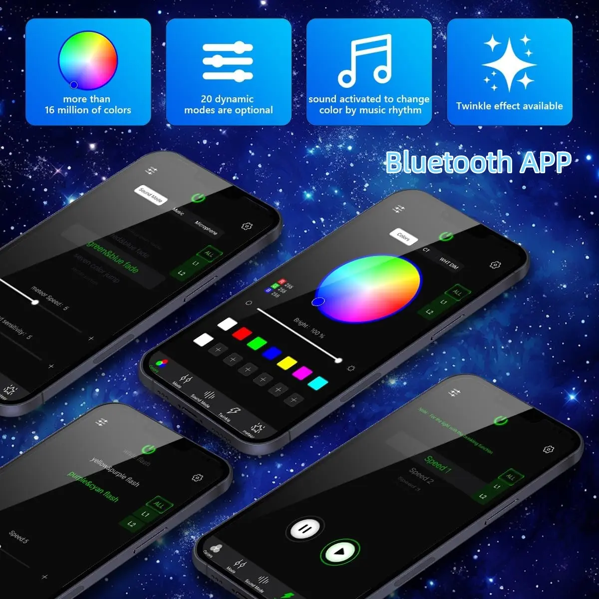 ·The Starlight Kit for car is equipped with a 28-button remote control and wireless blue tooth APP control function, which can switch 1600 millions colors (pure white, mixed white, red, green, blue, yellow, ice blue, purple, etc.) and 20 dynamic color modes, and you can also adjust the brightness of the lights, the speed of dynamic colors, the speed of the blinking, and the sensitivity of music modes according to your own preferences