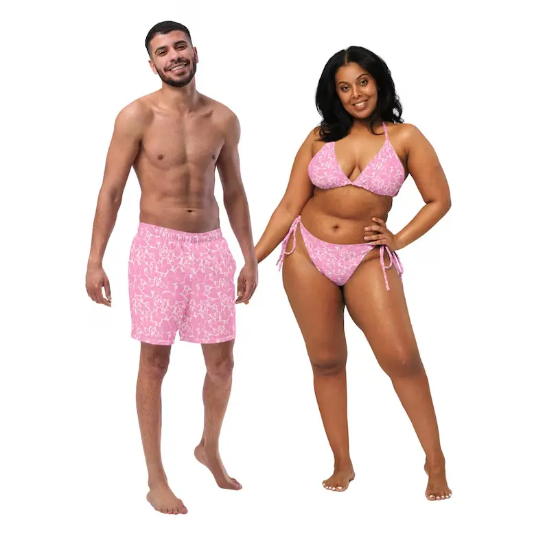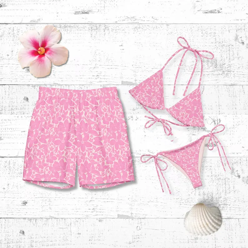 5. Romantic Floral Couples Swimwear - His & Hers Tropical Beach Honeymoon Matching Bathing Suits. Pink Swimwear