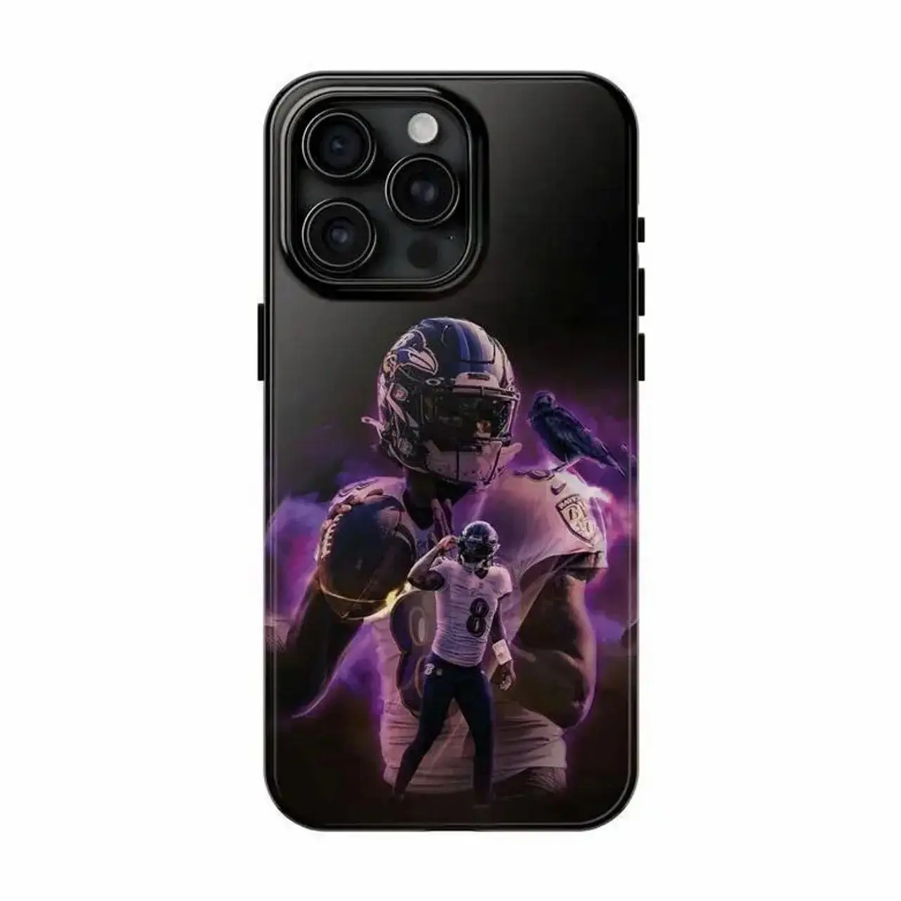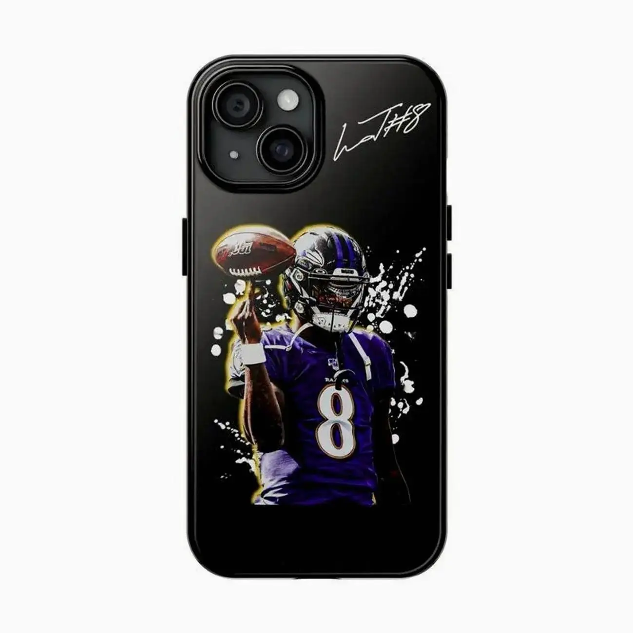 Lamar Jackson rugged phone case, modeled after a football player, shockproof and compatible with iPhone 17/16/15/14/13/12/11 Pro Max/Plus and Samsung Galaxy S23FE/22/23/24/25.