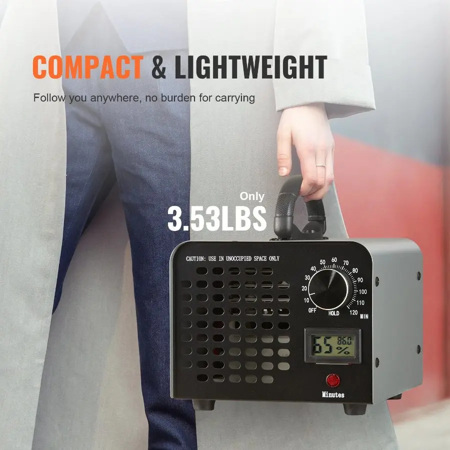 With 36, 000mg/h powerful max ozone output and 3, 230 square feet coverage area, VEVOR ozone generator prioritizes your health by effectively eliminating odors, smoke, and pollutants from air. It features humidity display and 0-120 minute timer, ensuring indoor environment is constantly monitored.