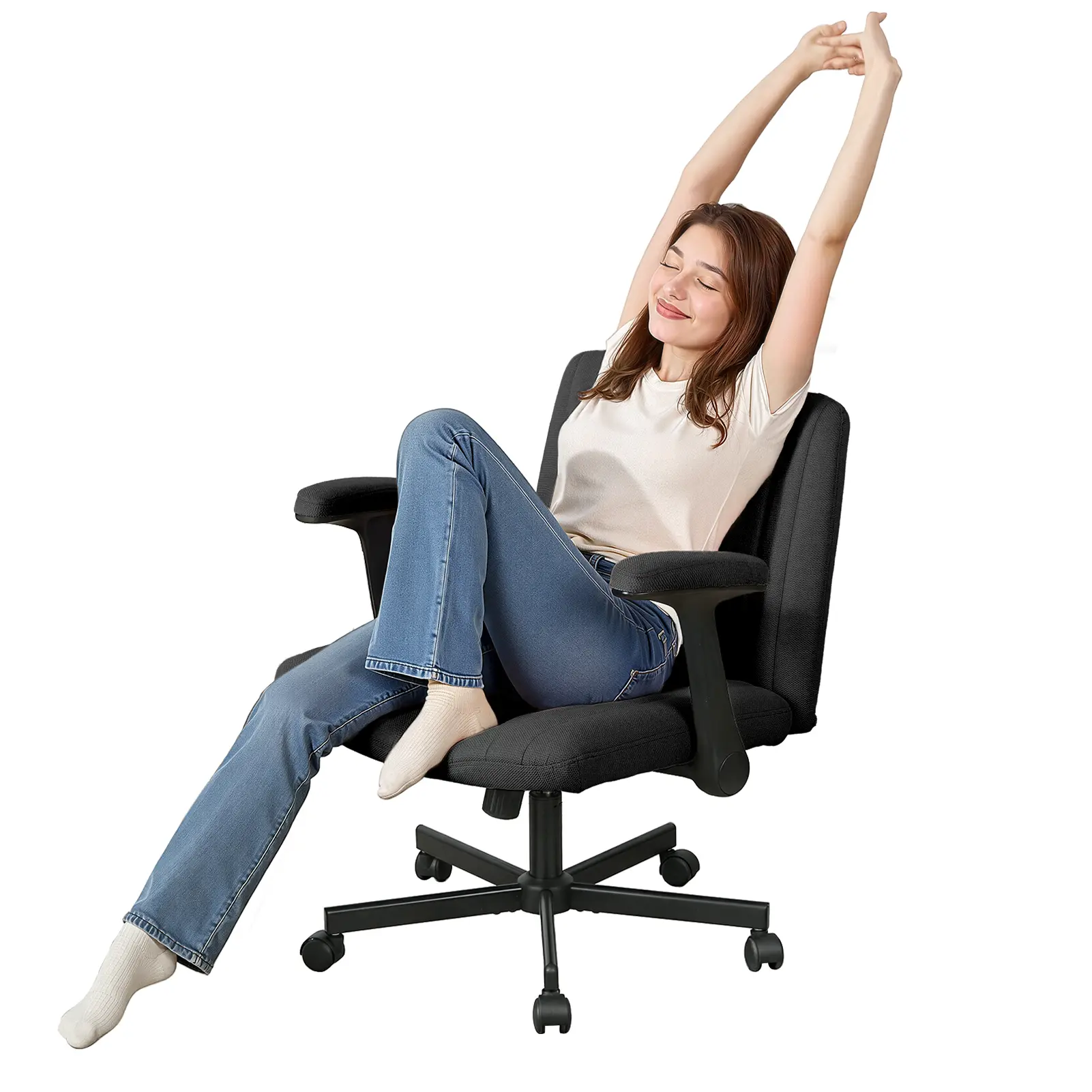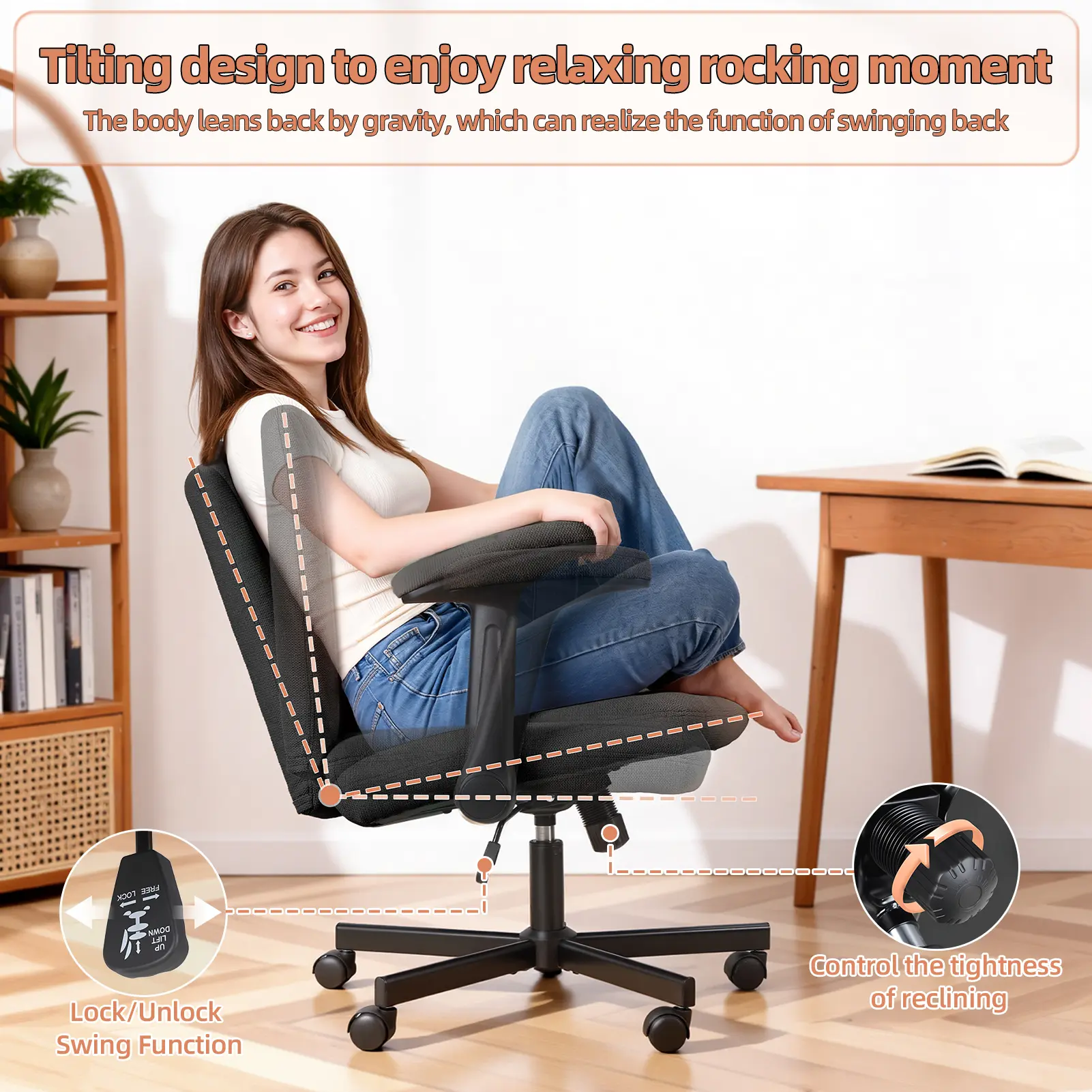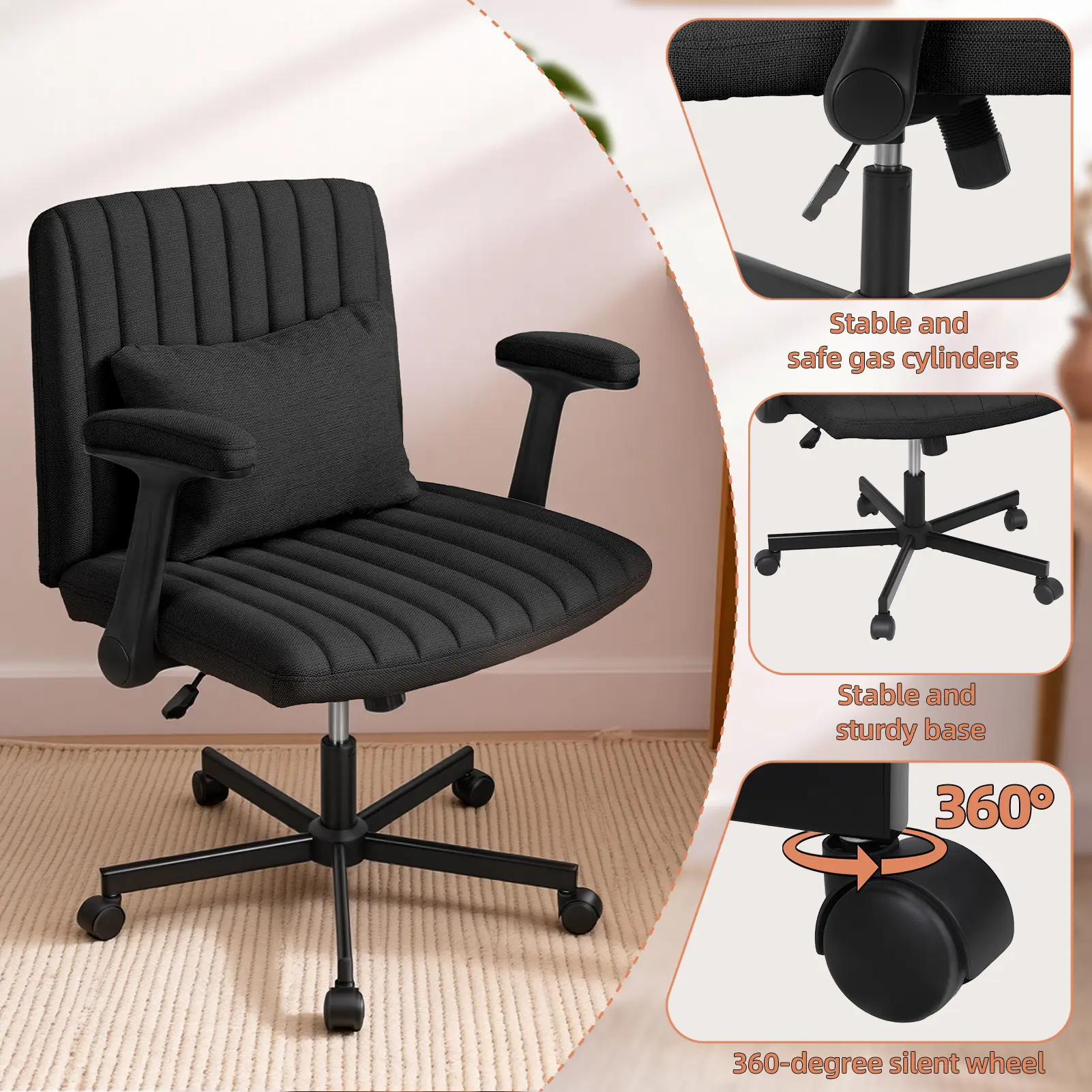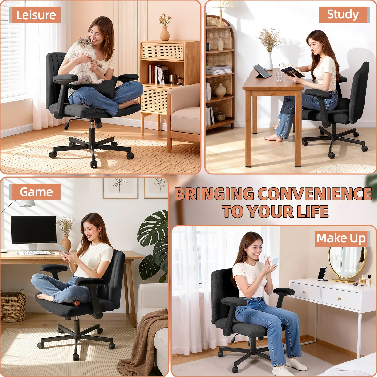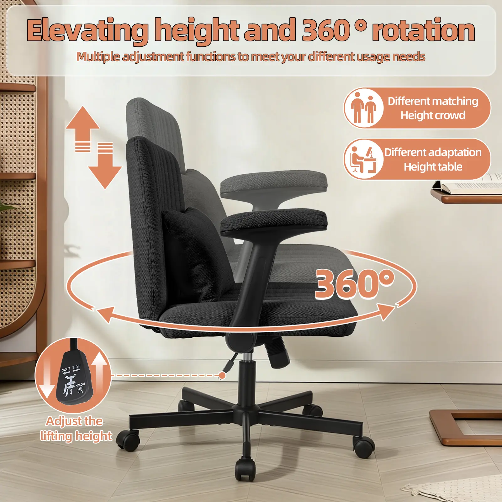 Soft Modern Upholstery: The seat and backrest are wrapped in a towel-textured, skin-friendly fabric that provides a soft, contemporary look and touch, making this stylish and comfortable office chair perfect for apartments, home offices, or creative spaces seeking a warm and inviting ambiance.