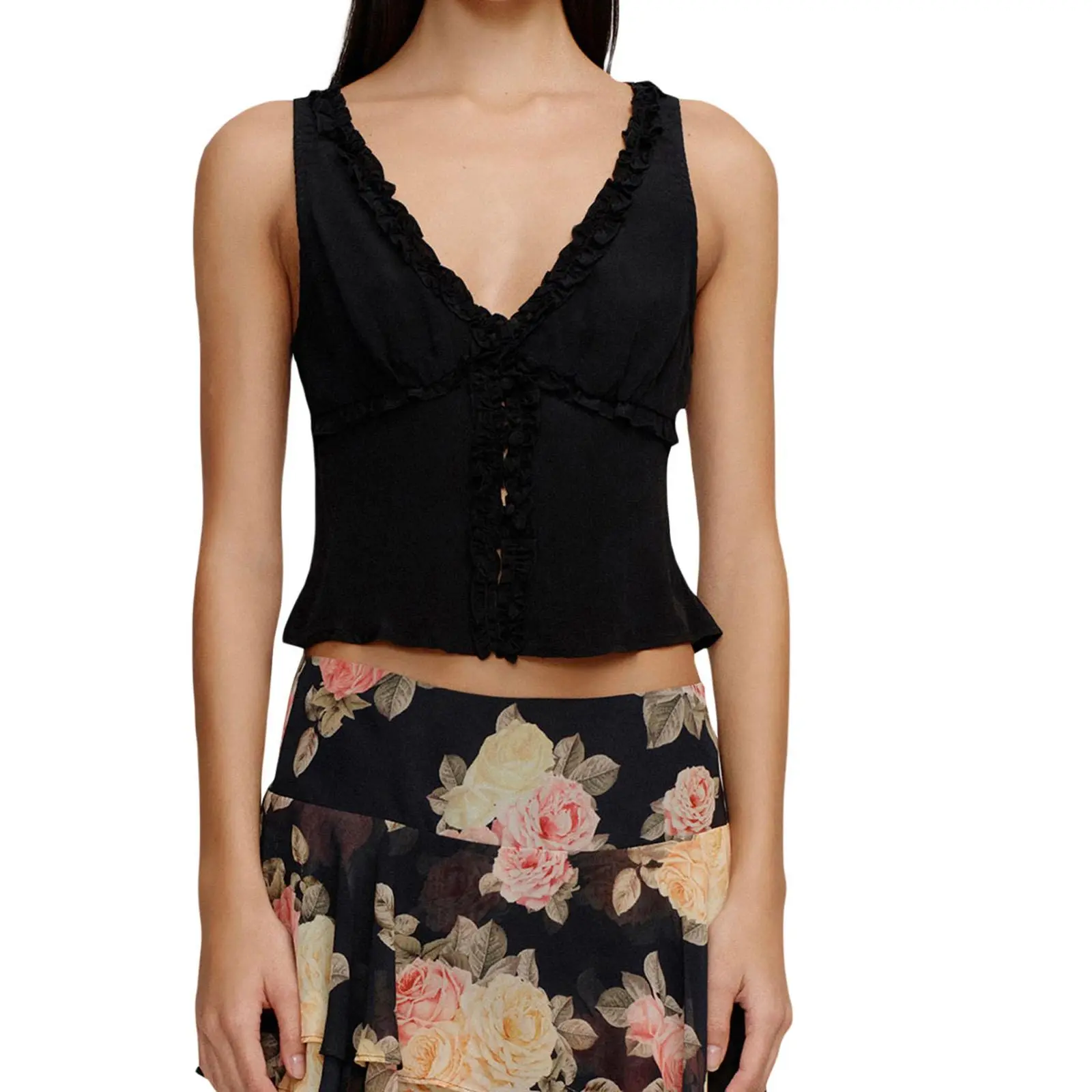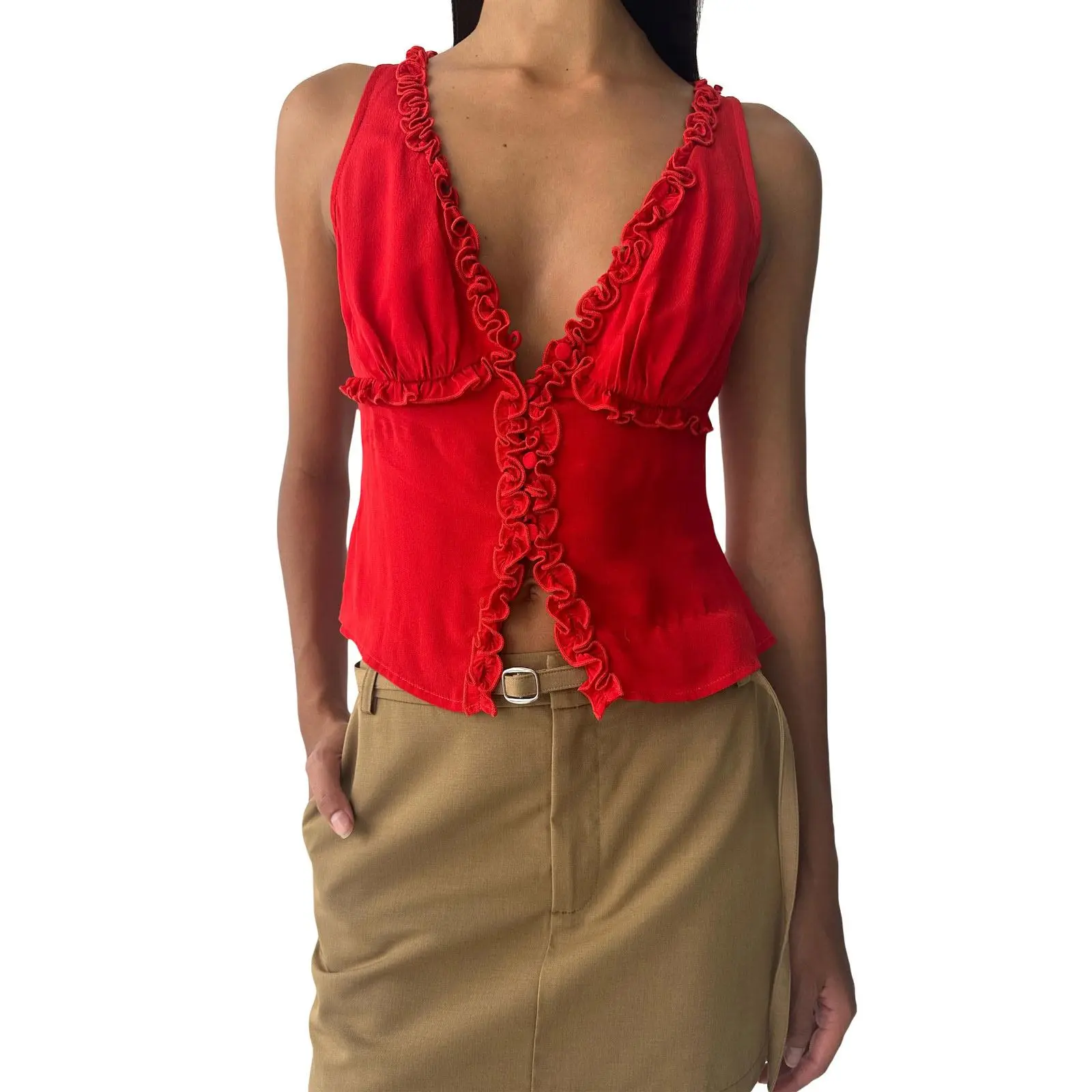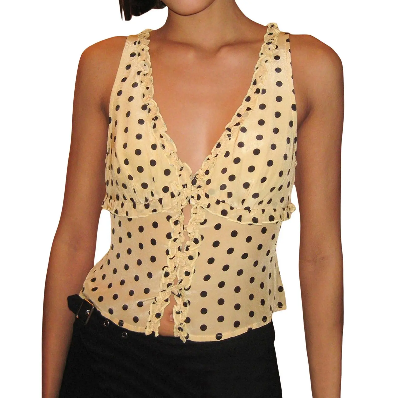Women Frill Trim Tank Tops Slim Solid Color/Dot Print Deep V Neck Sleeveless Button-up Vest Casual Summer Streetwear Size (cm) SLength: 50Shoulder: 31 Waist: 75Under Bust: 84Hem: 92 MLength: 51Shoulder: 32 Waist: 79Under Bust: 88Hem: 96 LLength: 52Shoulder: 33.5Waist: 85Under Bust: 94Hem: 102 Size (inch) SLength: 19.68Shoulder: 12.2 Waist: 29.53Under Bust: 33.07Hem: 36.22 MLength: 20.08Shoulder: 12.6 Waist: 31.1 Under Bust: 34.65Hem: 37.8 LLength: 20.47Shoulder: 13.19Waist: 33.46Under Bust: 37.01Hem: 40.16 Specification: Size: S/M/L Materials: 95% Polyester and 5% Elastane Pattern: Solid Color/Dot Print Color: Red/Yellow/Black Gender: Lady Package Contents: 1 * Tops Note: 1. Please understand there may be a 1-2 cm deviation exist. 2. Due to the lighting and monitors, there is a slight difference between the picture and the real item. Promise: If the product has any quality problems, please relate with us, we will help you solve the problem as quickly as possible.