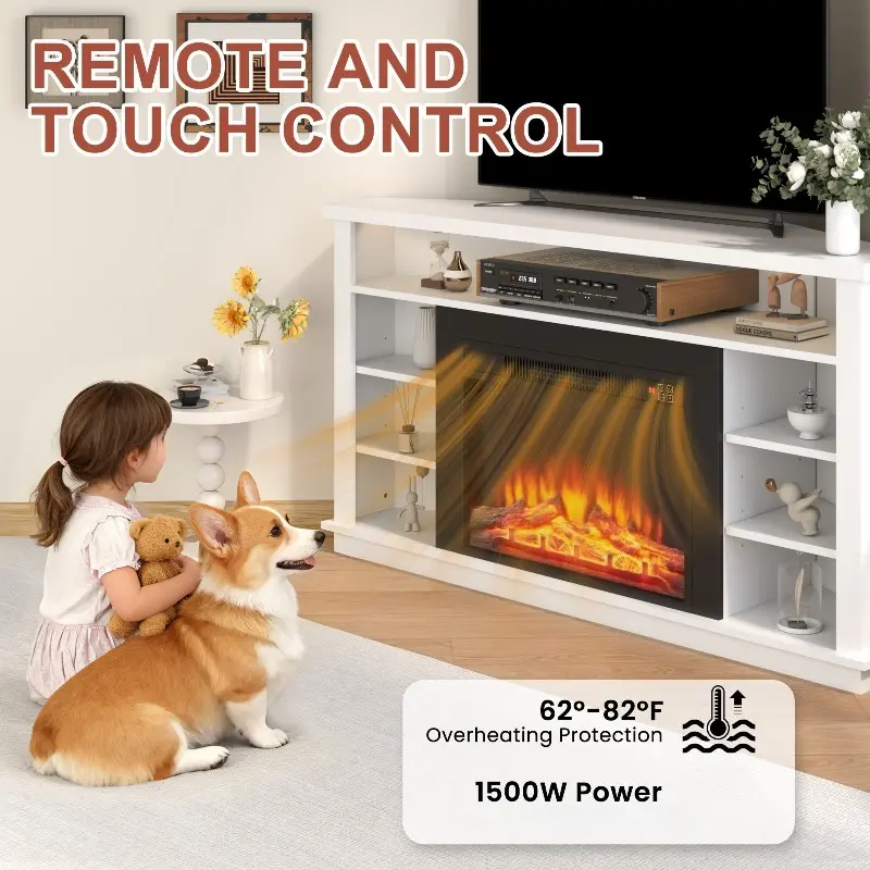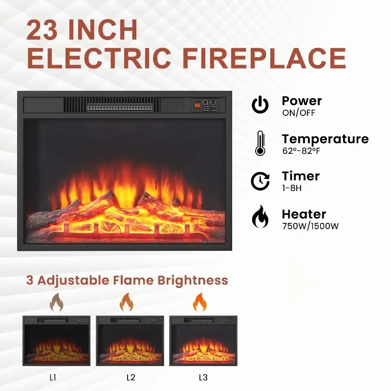 23" Electric Fireplace Heater: The 23" electric fireplace features 750W/1500W heating, 62–82°F temperature control, 1–8 hour timer, overheat protection, and 3 flame levels. Enjoy the cozy flame with or without heat.