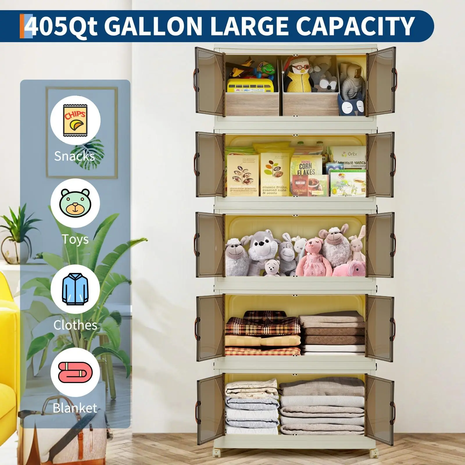 【Large Capacity】Say goodbye to clutter with this 5-tier storage system, boasting a massive 405QT total capacity (81QT per tier). Perfect for bulky comforters, pillows, seasonal clothing, and household essentials. The collapsible design allows each tier to fold down to just 2.6 inches when not in use, maximizing vertical space and making storage a breeze whether moving house or organizing your home.
