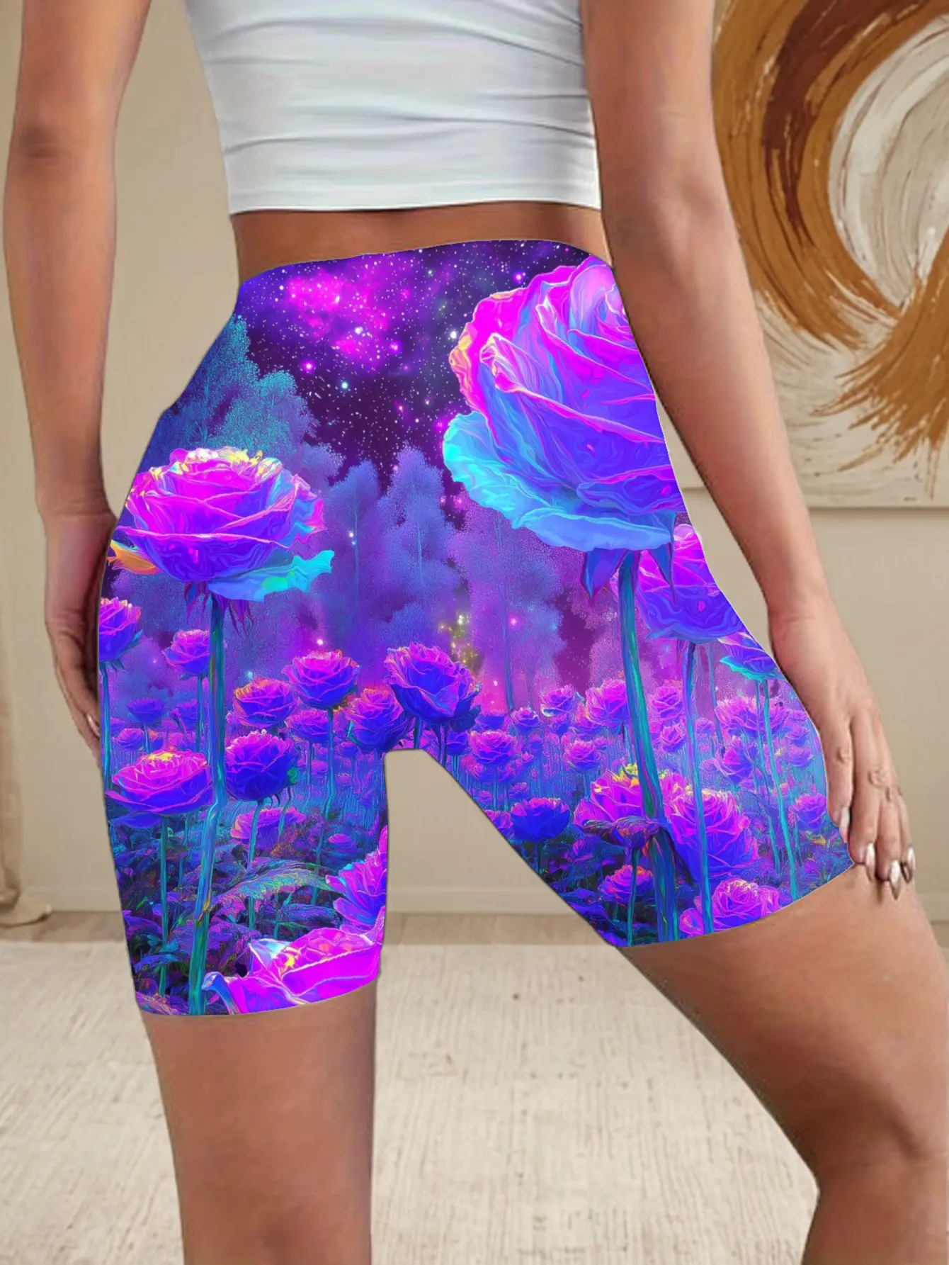 Women's Plus Size High-Waisted Yoga Shorts - Cosmic Rose Print Sports Shorts, available in neon pink, purple, blue, green, and rose pink - Medium stretch leggings, suitable for gym, running, cycling, all-season workouts, and outdoor activities (non-