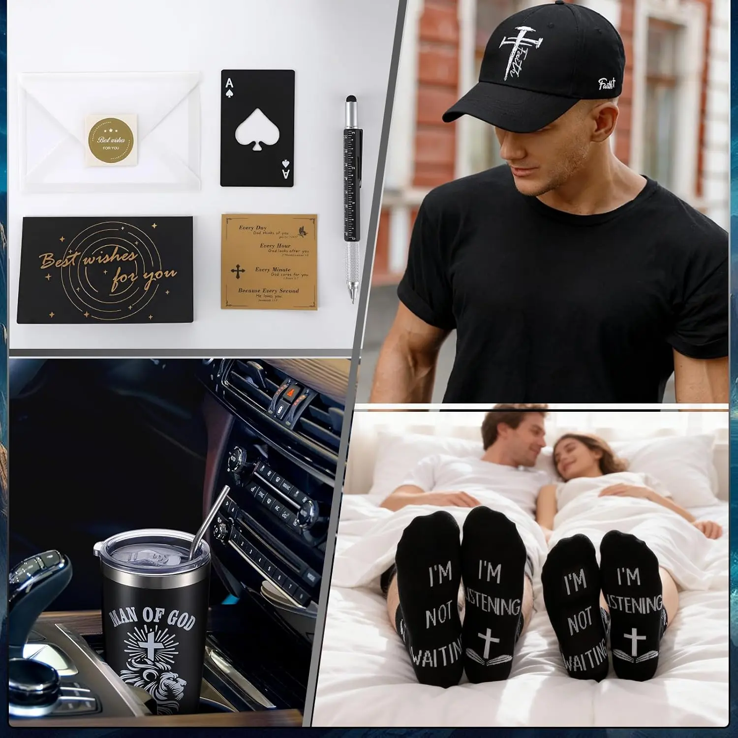 ·Comfortable Hat and Socks: This baseball cap features a bold white cross, the cozy socks add a playful touch with the message, “I’M LISTENING, I’M NOT WAITING,” and a cross design. Perfect for daily wear, these items celebrate faith even in casual moments