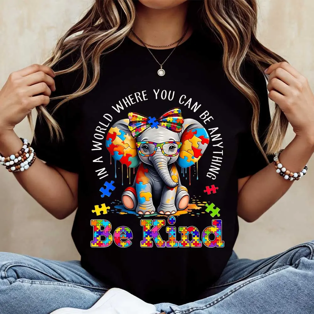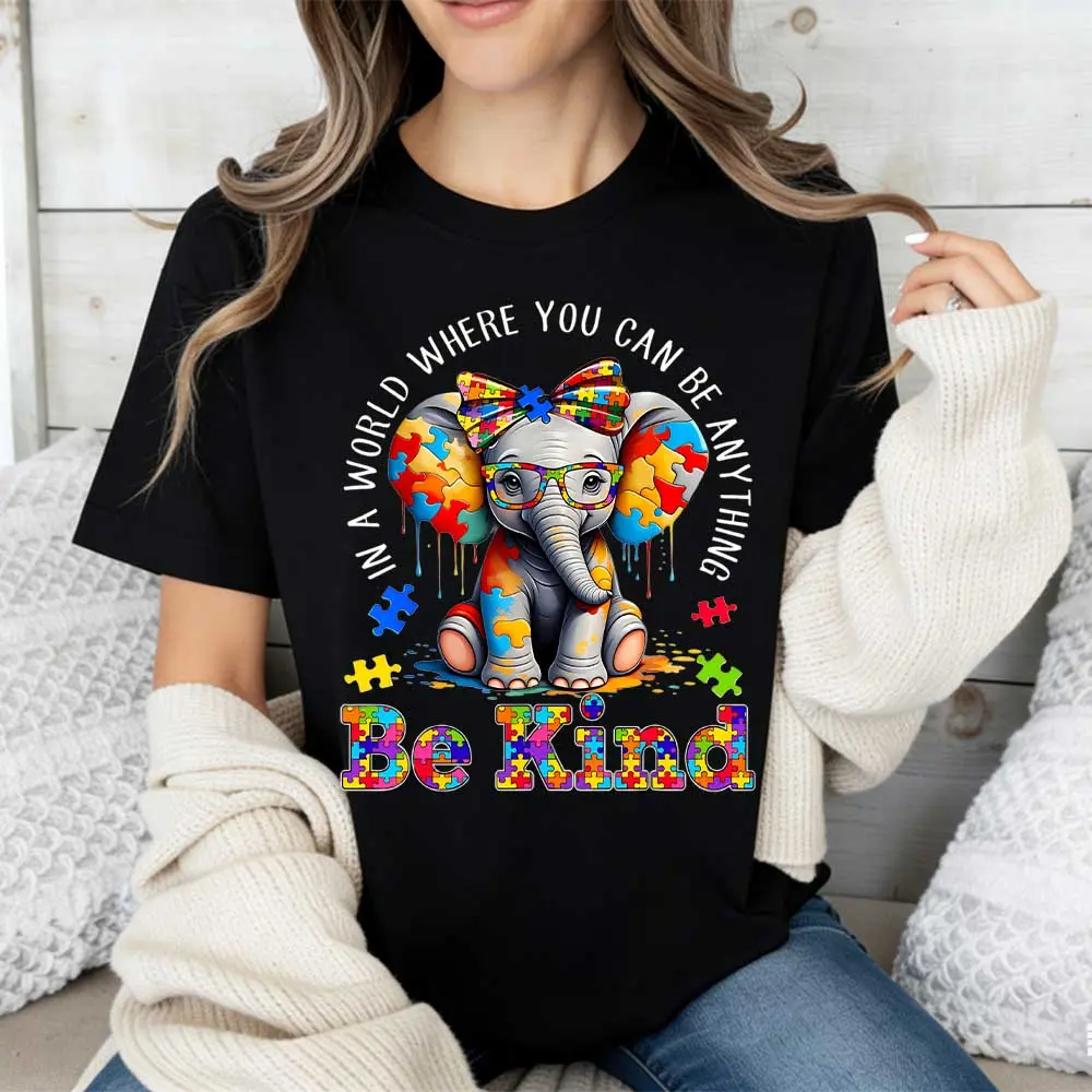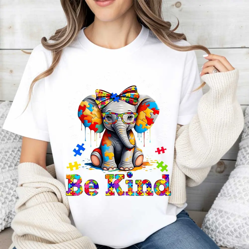 Elephant With Puzzle Pieces And Be Kind Print T Shirt Crew Neck Casual Wear For Women And Girls
