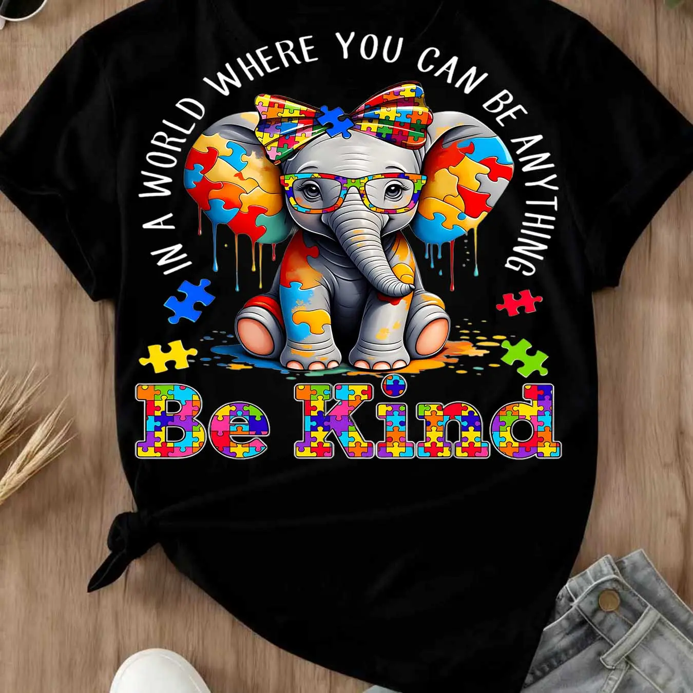 🌟Elephant With Puzzle Pieces And Be Kind Print T Shirt🌟