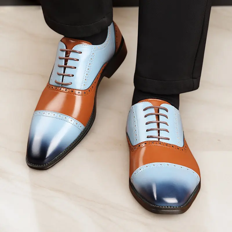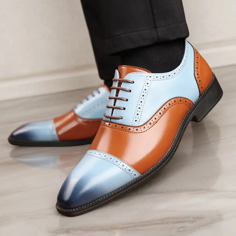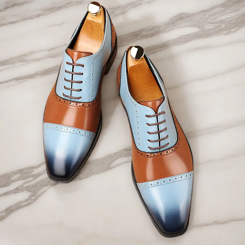 These men's formal oxford shoes feature a striking two-tone design, combining warm tan, soft sky blue, and a sleek blue gradient at the toe, with intricate brogue perforations and a classic lace-up closure. The polished, streamlined silhouette delivers a sophisticated, timeless look, perfect for business meetings, weddings, and formal events.