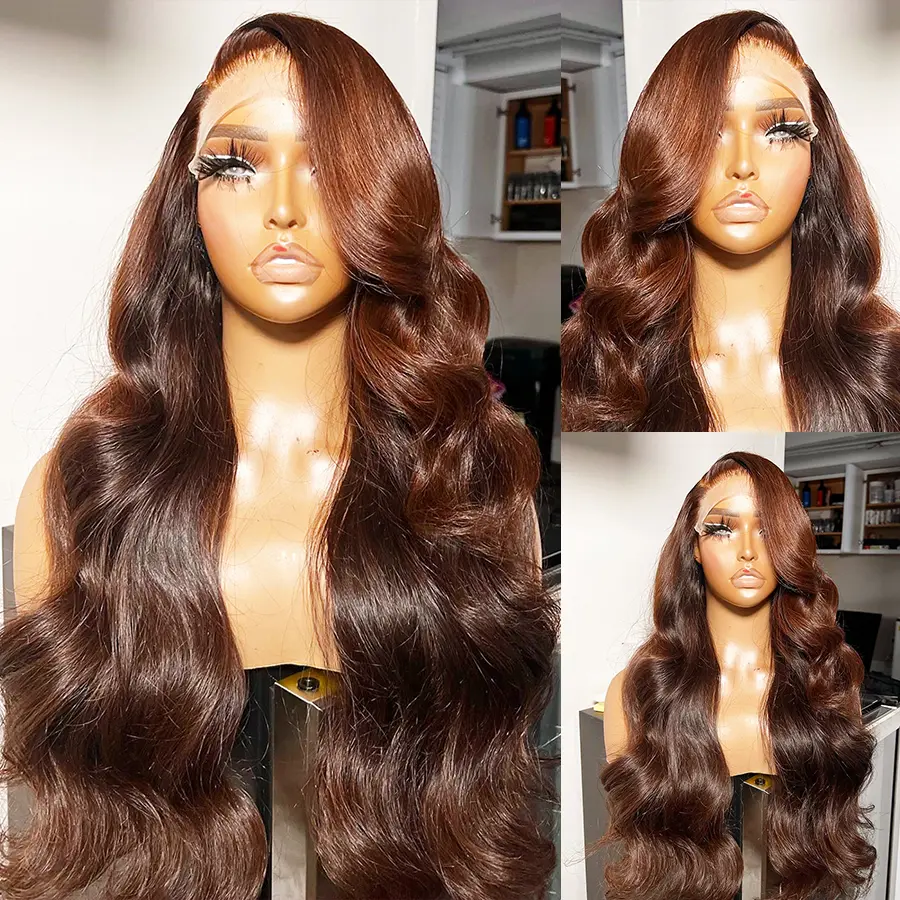 200% Density Chocolate Brown Human Hair Wigs 13x4 Body Wave Lace Front Wig Pre Plucked Chestnut Brown Colored Wigs Blended Hair For Women Light Brown HD Transparent Lace Front Wig
