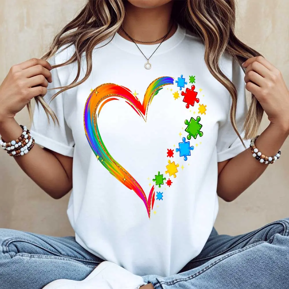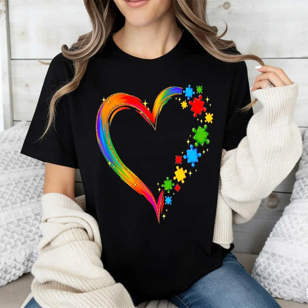 5. Rainbow Heart And Puzzle Pieces Print T Shirt Casual Loose Fit For Autism Awareness Daily Wear