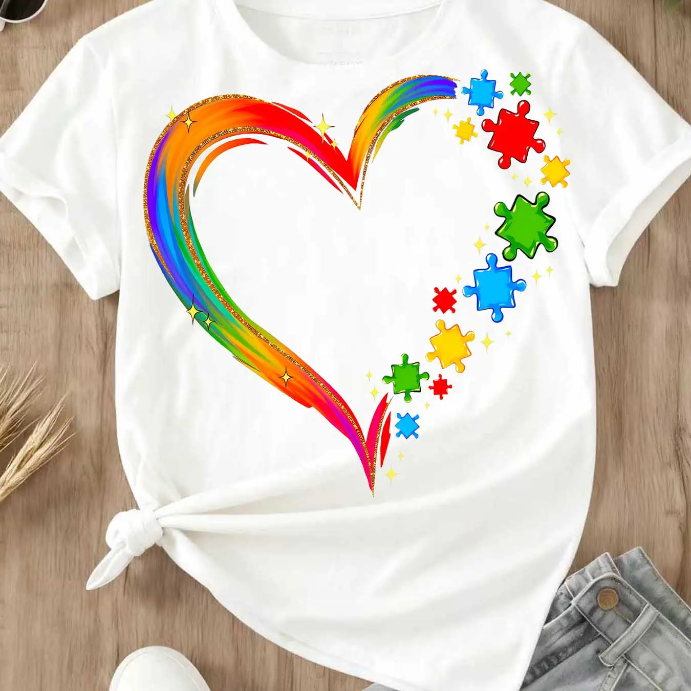 Rainbow Heart And Puzzle Pieces Print T Shirt  Casual Loose Fit For Autism Awareness Daily Wear