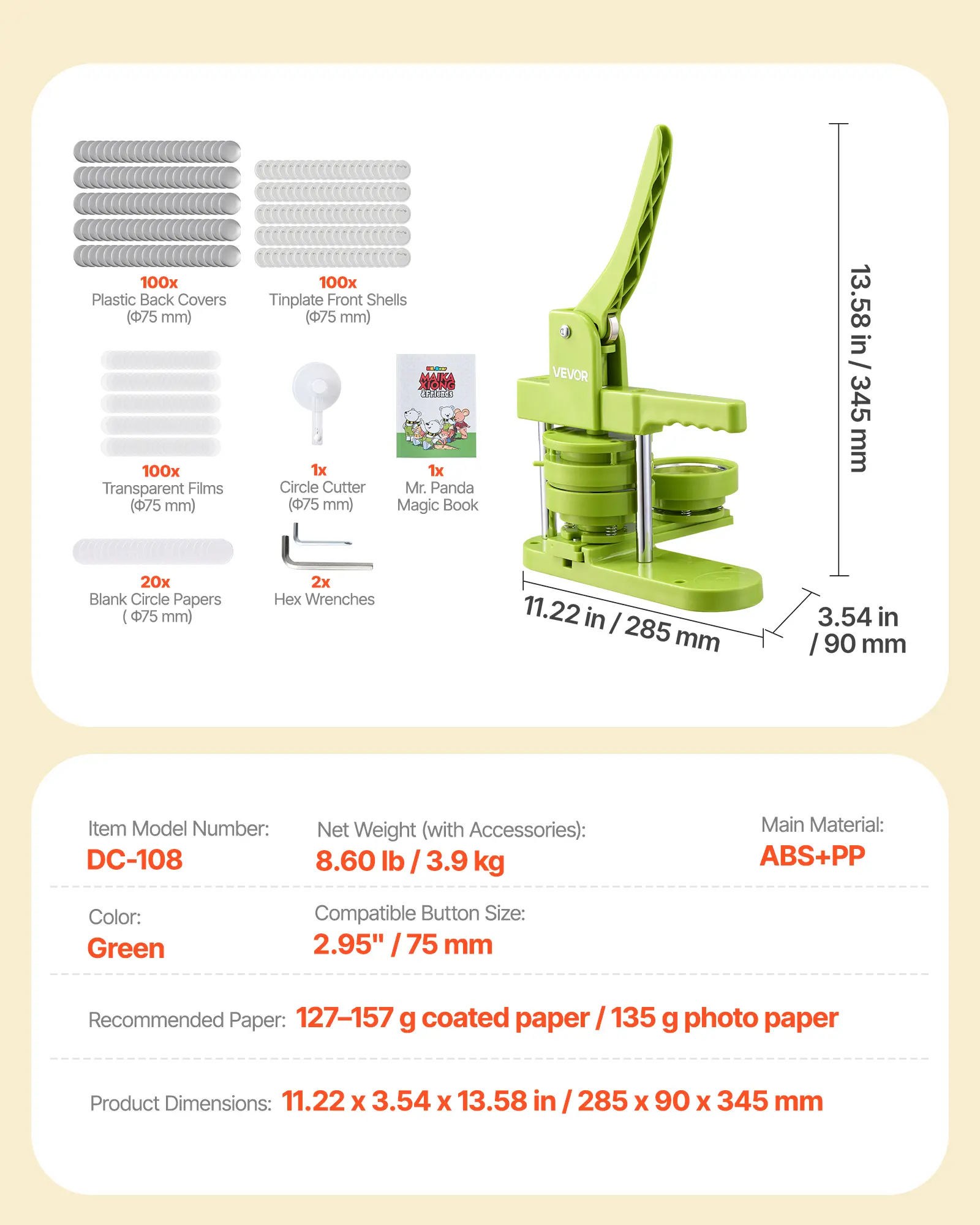 Complete DIY Kit Included: This button press machine comes with everything you need: 100 plastic backs, 100 tinplate fronts, 20 blank papers, 100 films, a circle cutter, 2 hex wrenches, a magic book, a button mold set, 2 pins, and a user manual