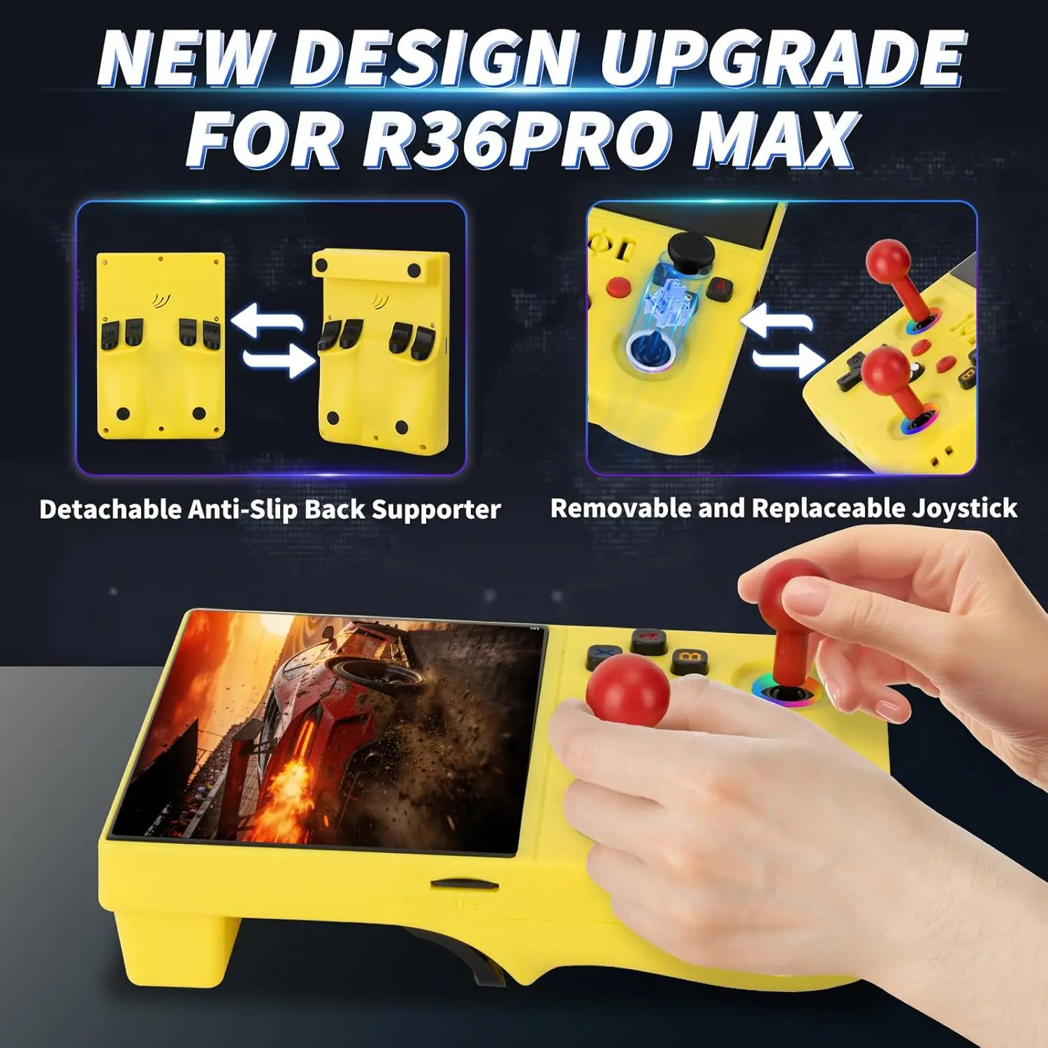 ·Precision-Upgraded Console, Big Delights:The R36MAX Ⅱ retro handheld game console’s comfortable grip and excellent design fully embody the concepts of "practicality" and "functionality".It has undergone some design upgrades. On the back of the game console, a detachable anti-slip support device has been added, allowing players to place the game console flat, freeing their hands, and it is also equipped with two detachable upgraded joysticks, providing players with a more thrilling gaming experience.This R36MAX Ⅱ is an ideal choice as a birthday gift or other festivals gift
