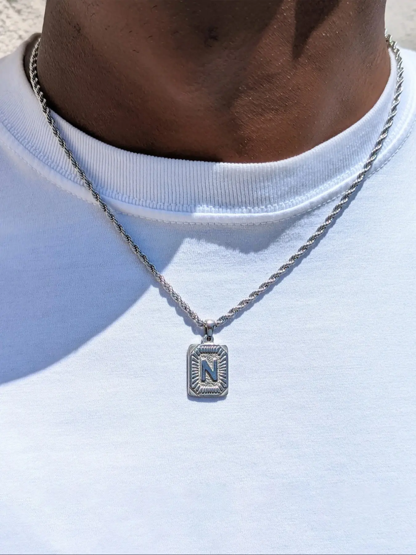 Men's Necklace with Square Pendant and Initial Letter, Stainless Steel Jewelry with Rope Chain, Personalized A-Z Letter Design Gift