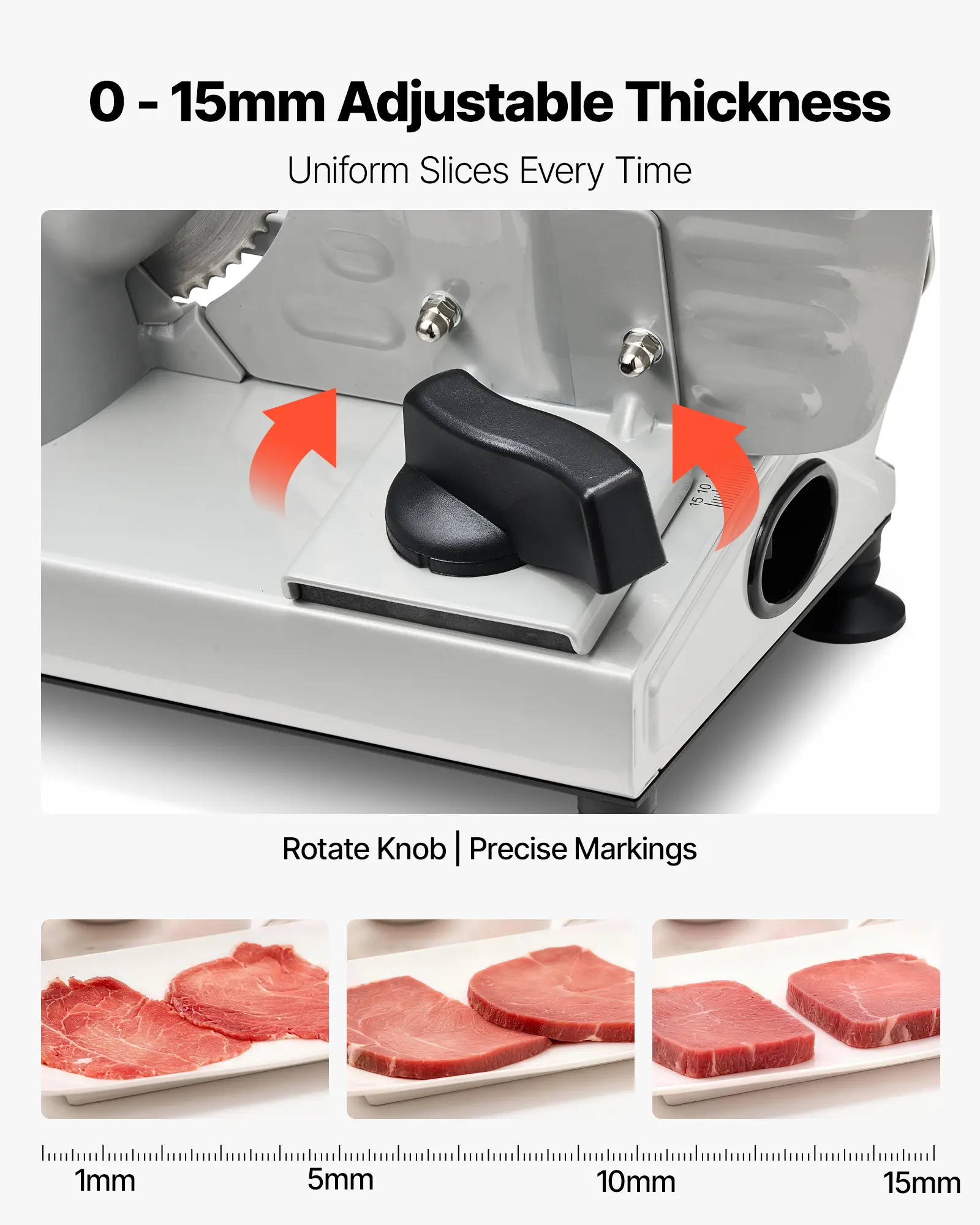 0-15 mm Thickness Adjustment: Featuring a precise knob, this electric meat slicer allows you to easily and accurately adjust slice thickness from 0 to 0.6 in (0 to 15mm), ensuring uniform slices, ideal for cutting meats, deli meats, roast beef, turkey breast, baguettes, vegetables, and fruits