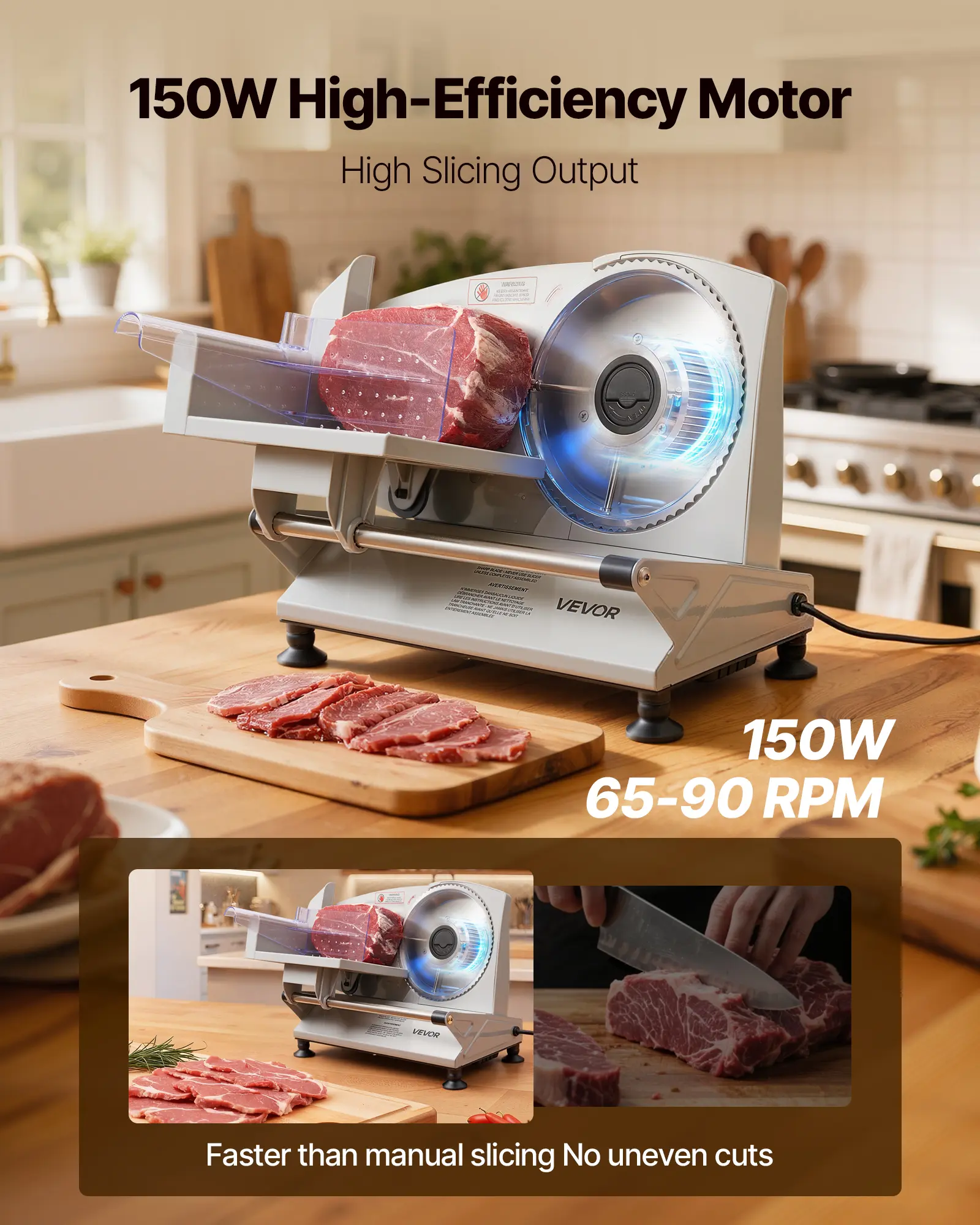 Efficient Meat Cutting: This meat slicer is equipped with one 170 mm (6.5 in) serrated stainless steel blade and one 170 mm (6.5 in) smooth stainless steel blade, driven by a 150W motor. It slices at speeds of 65-90 RPM, ensuring smooth and even cuts