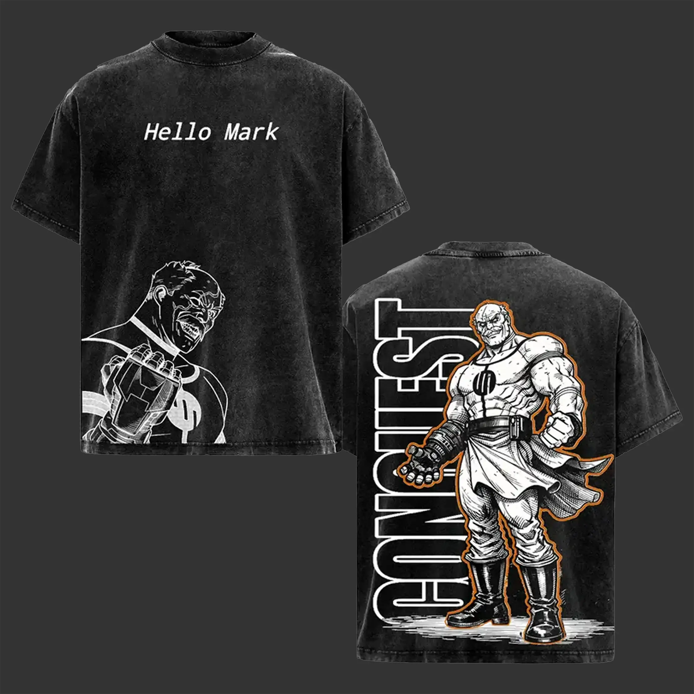 Conquest Shirt – Invincible Vintage Acid Washed Oversized Graphic T Shirt, Viltrumite Warrior Comic Streetwear, “Hello Mark” Quote Design, Dark Superhero Aesthetic, Heavyweight Cotton Unisex Tee, Back Print Casual Soft Top, Gift for Comic Fans