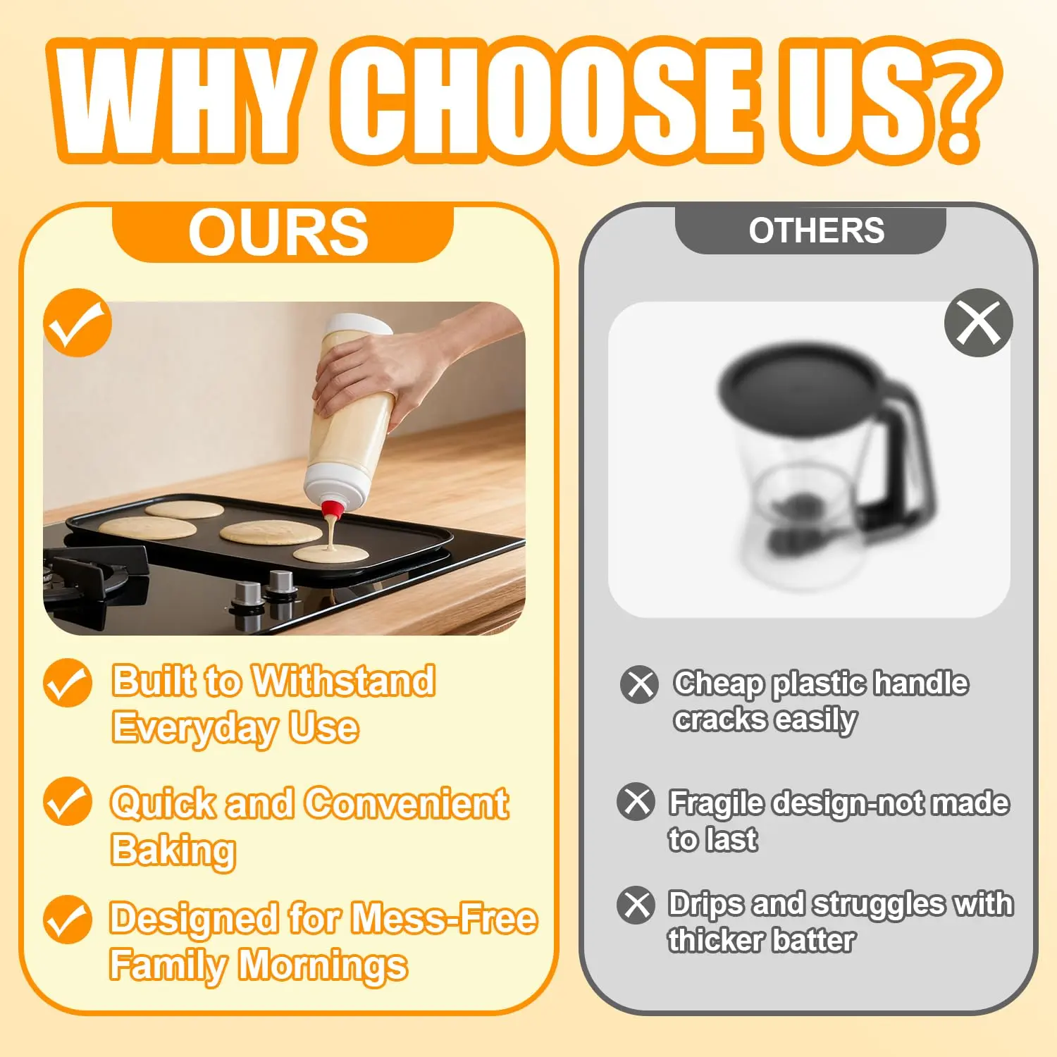 ·Durable, Large-Capacity Dispenser:Crafted from reinforced, BPA-free materials, this high-capacity pancake batter dispenser bottle is built to last. It withstands vigorous squeezing without cracking and features clear measurement markings for accuracy, ensuring reliable performance and perfect batter ratios every time.