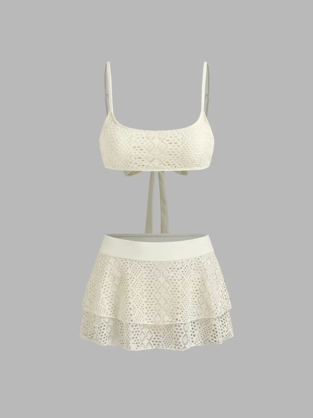 U-neckline Ruffle Hem Bracelet Bikini Set & Layered Cover Up Skirt