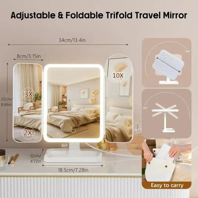 Portable LED Light Makeup Mirror, Lighted Makeup Mirror, Mirror with Lights, 3-fold Foldable Rechargeable Mirror with 2x 3x & 10x Magnification, Touch Control Mirror for Travel & Bedroom Use, Rechargeable Trifold Mirror