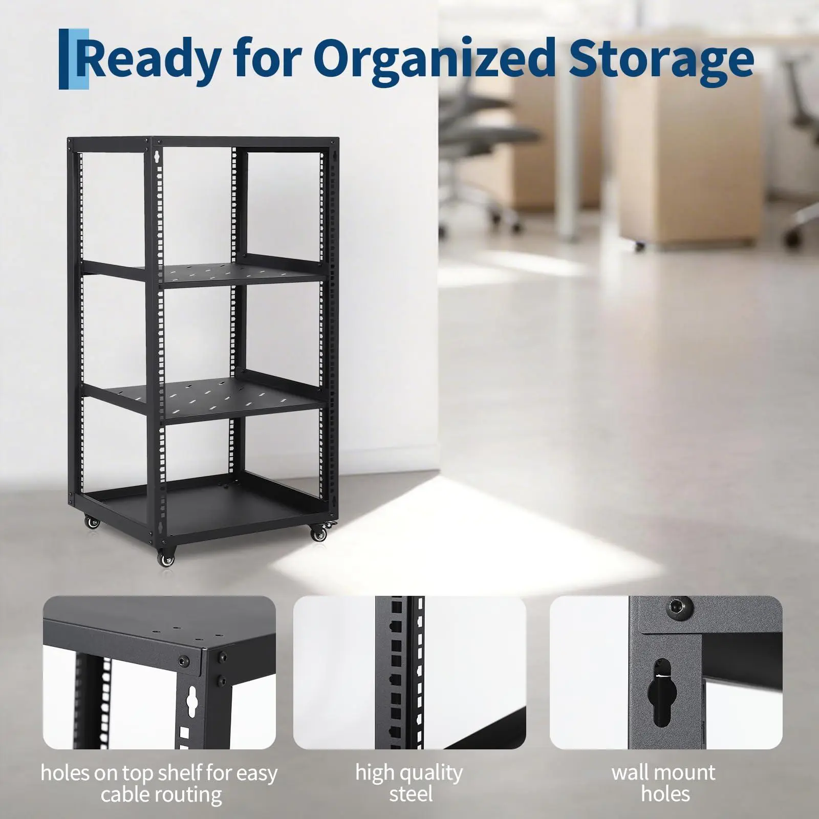 Practical & User-Friendly Structure: Features an ergonomic open frame with an additional top shelf for extra storage. Maximizes usable space and ensures convenient equipment installation, wiring, and daily maintenance. Equipped with smooth rolling    casters for easy mobility, allowing you to move the rack anywhere effortlessly.
