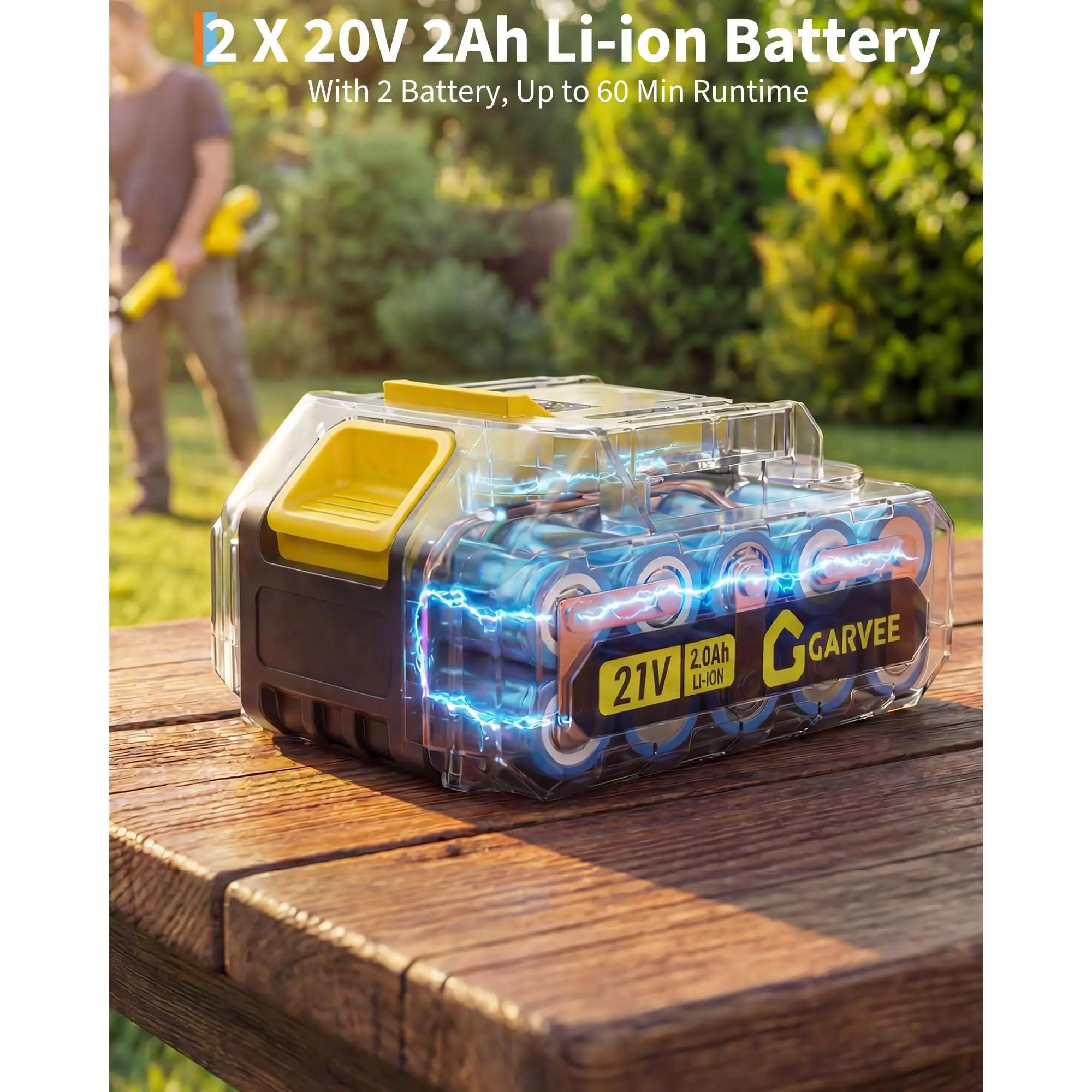 Powerful 20V Battery System with 2 Batteries: Includes two 2.0Ah batteries and a fast charger, delivering over 40 minutes of runtime for uninterrupted yard work. The motor spins at 6,500 RPM with a 12-inch cutting width for efficient trimming.