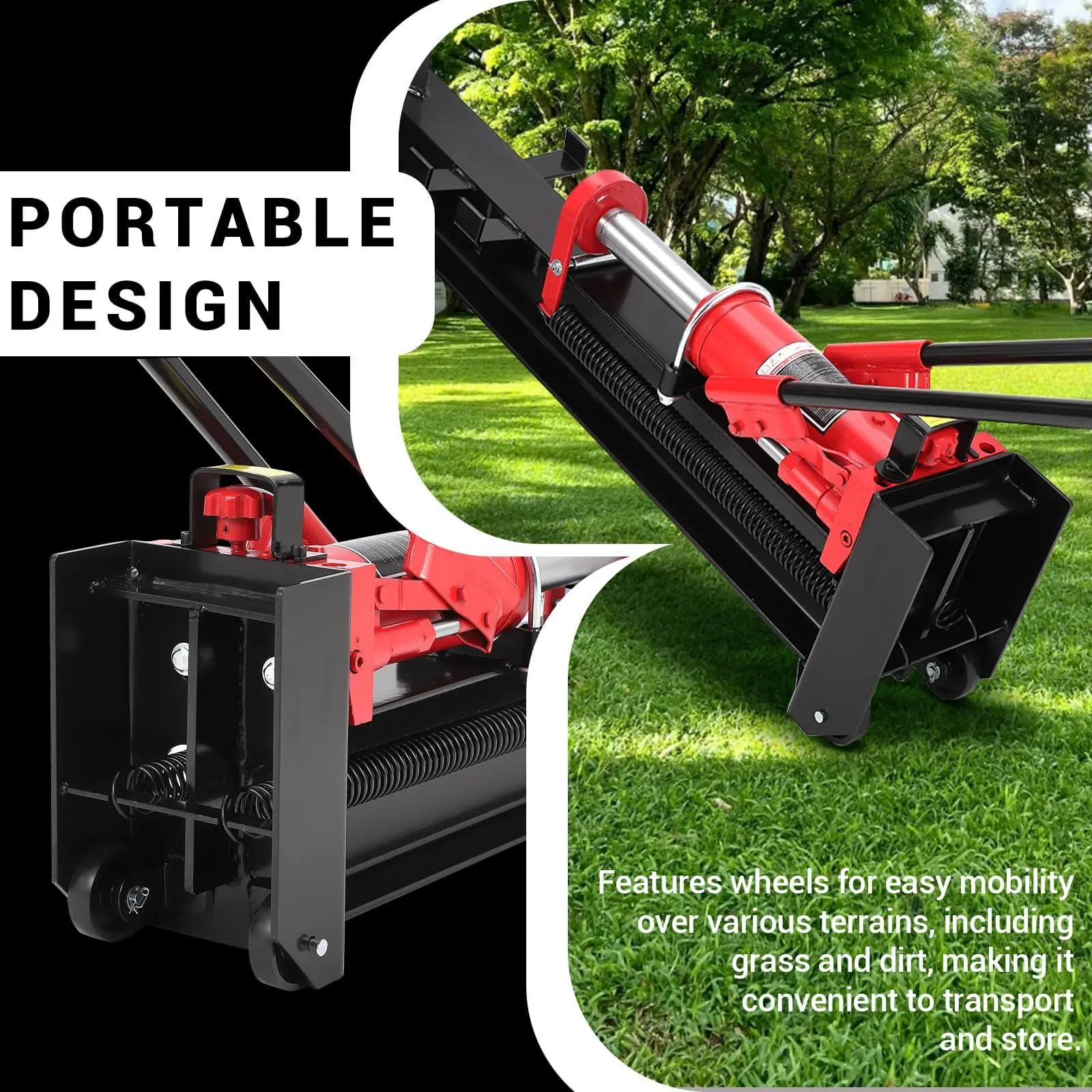 [Efficient and Portable] Featuring a spring-loaded return knob for quick piston reset, enhancing splitting efficiency. Built-in wheels facilitate easy movement on grass, mud, and uneven terrain, making it easy to carry, transport, and store.