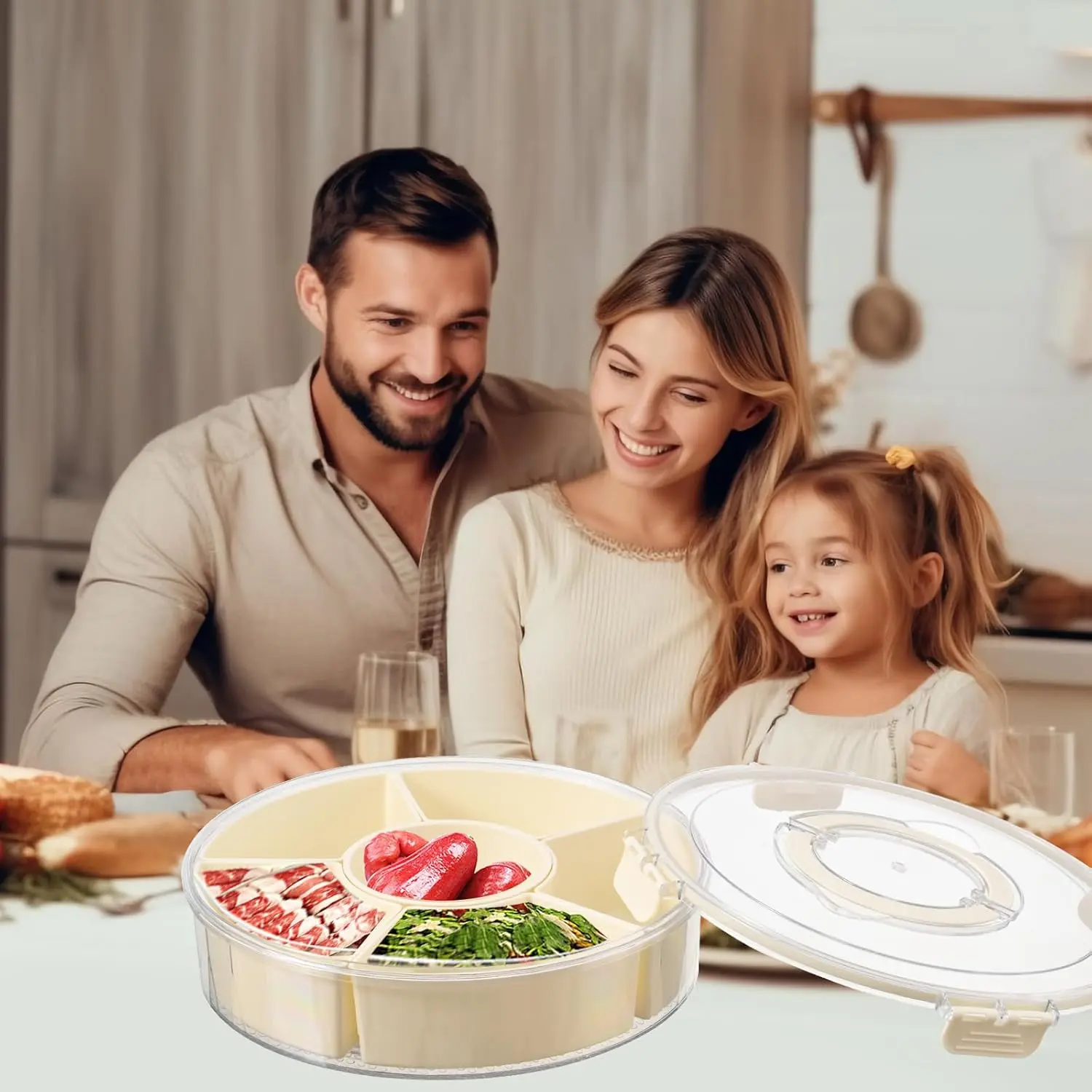 This set includes a divided serving tray with a lid and handle. Perfect for organizing fruits, candy, and veggies. Stackable design saves space. Ideal for kitchen, parties, travel, picnics, and meal prep. Each tray is portable and spinning, with rounded edges for safety.