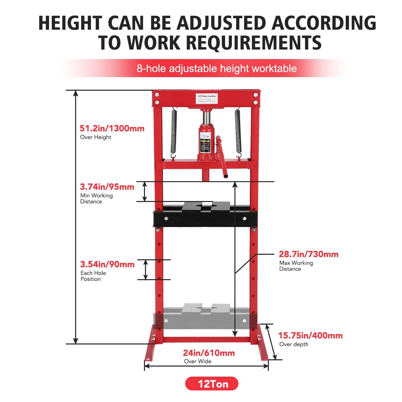 Safety Features : Safety is prioritized with a relief valve that activates automatically when pressure exceeds 12 tons, avoiding overpressure damage. Additionally,height-adjustable holes on each side allow you to customize the working table height to meet your needs.