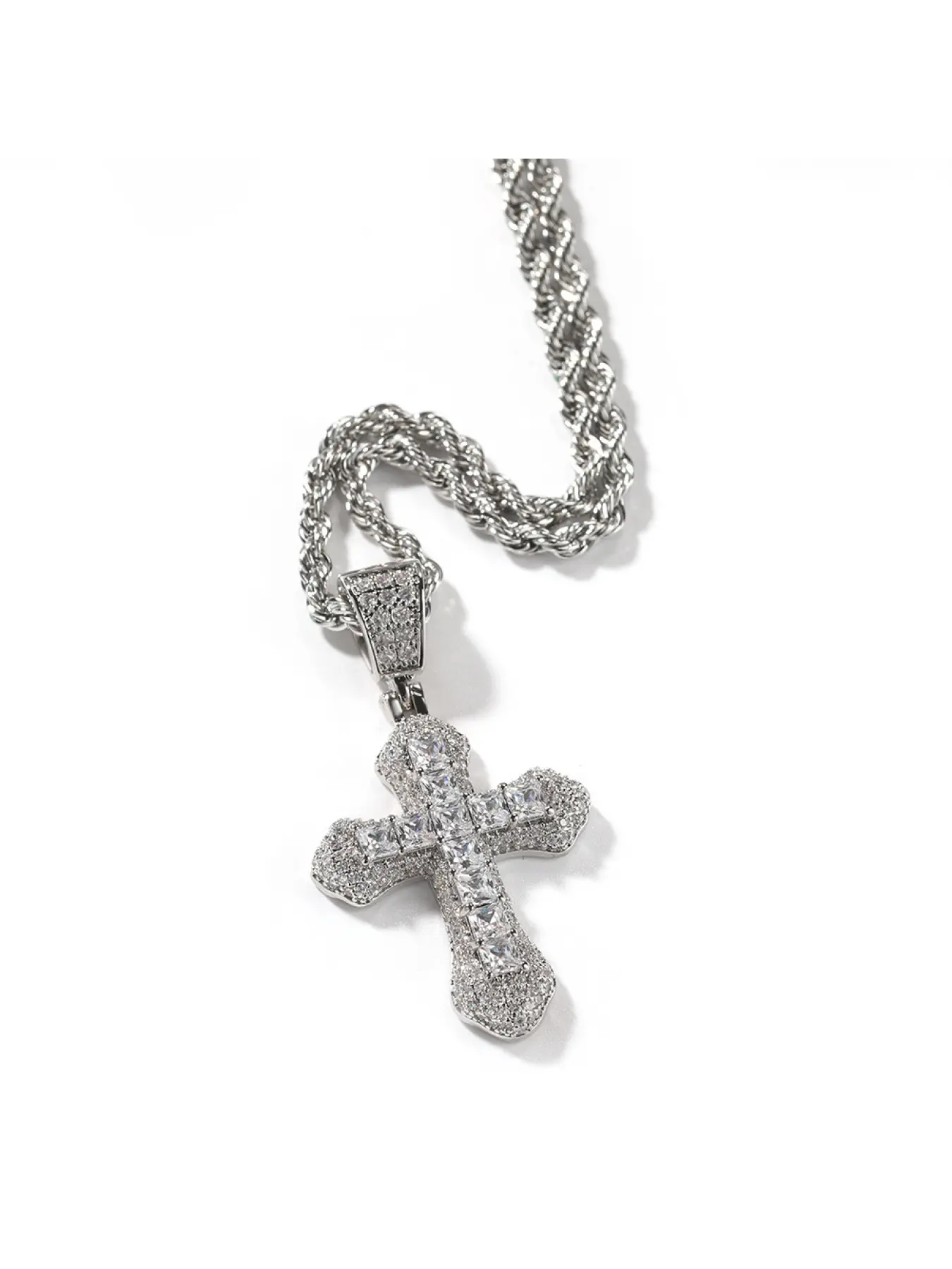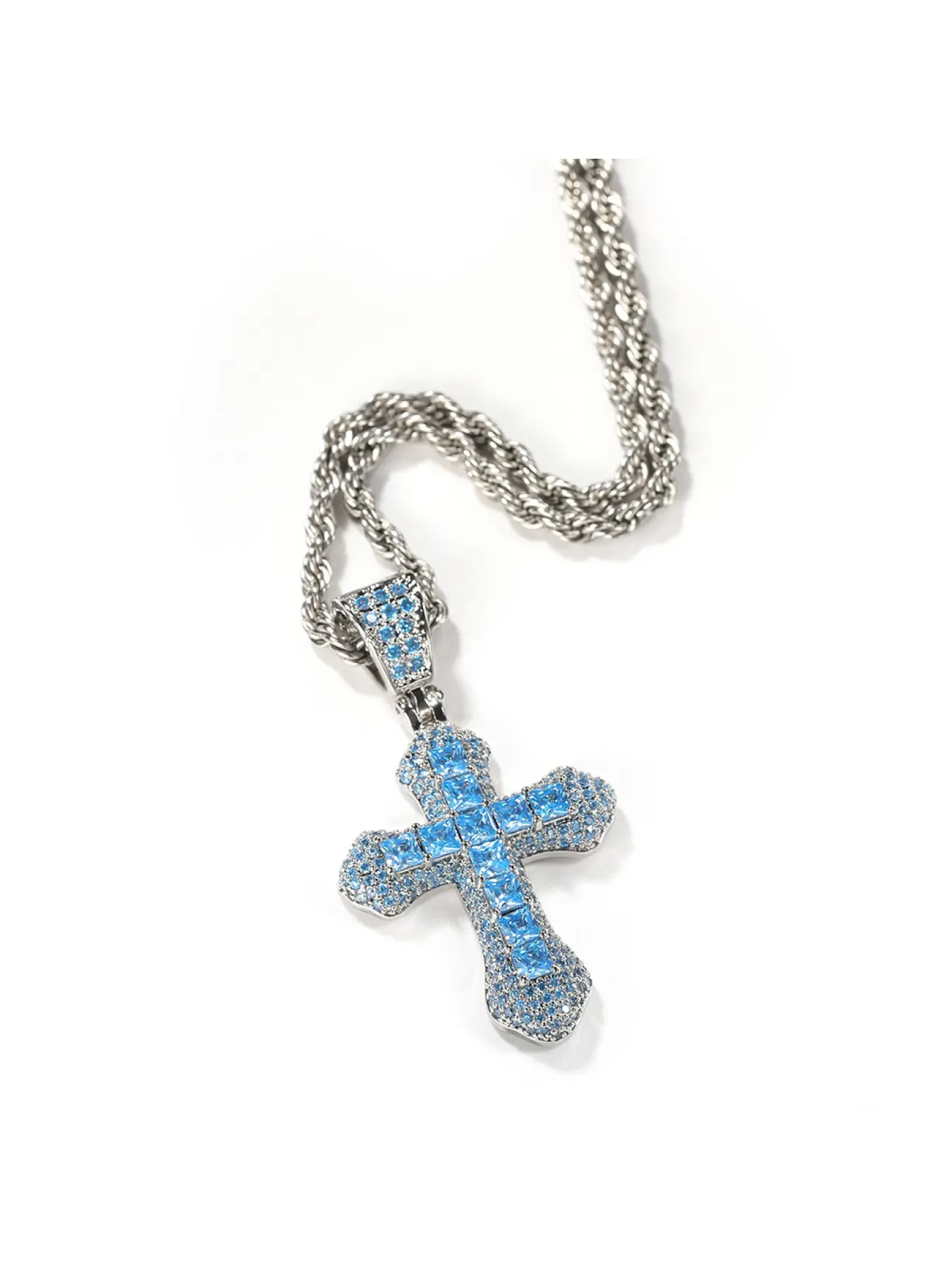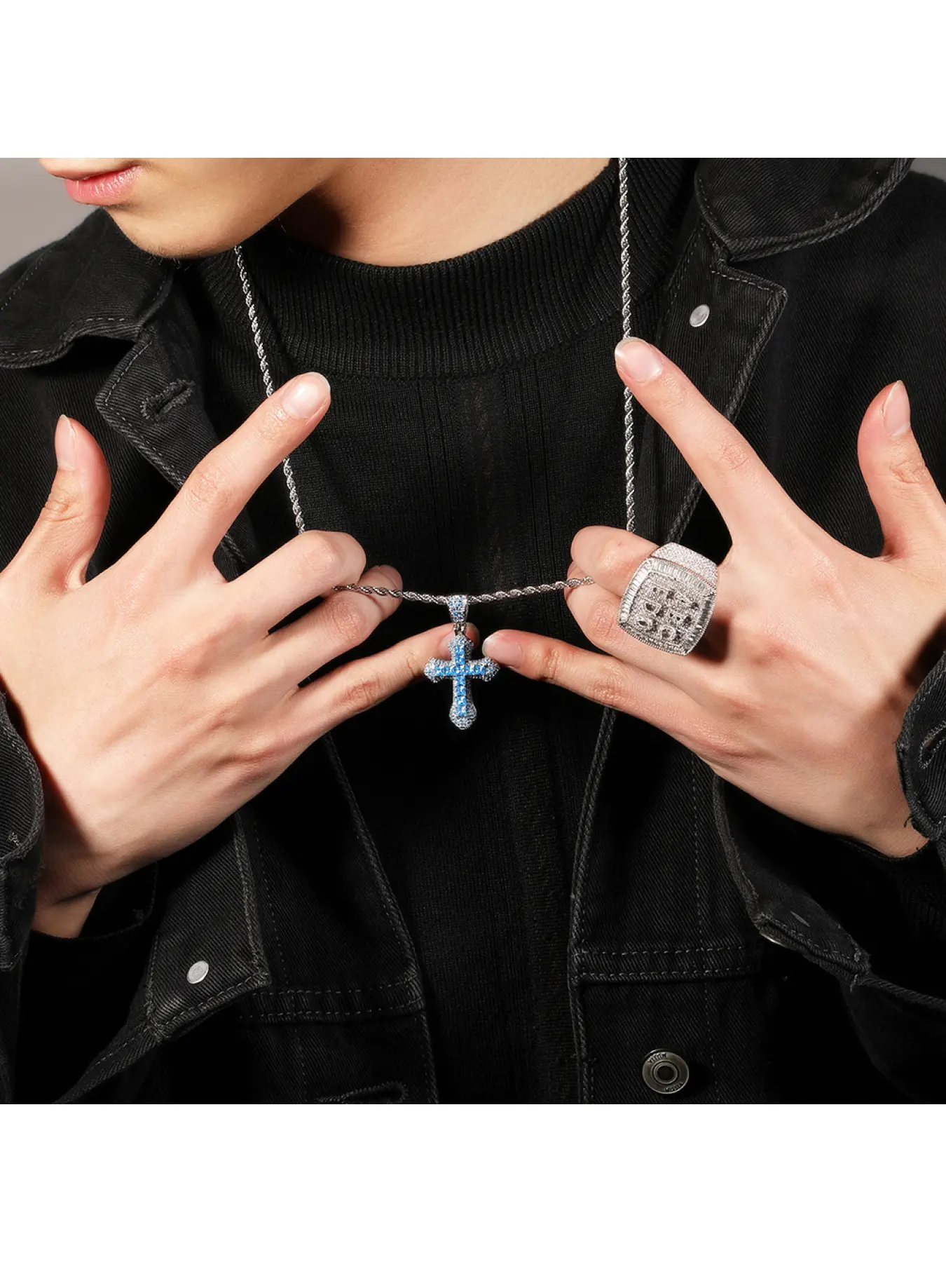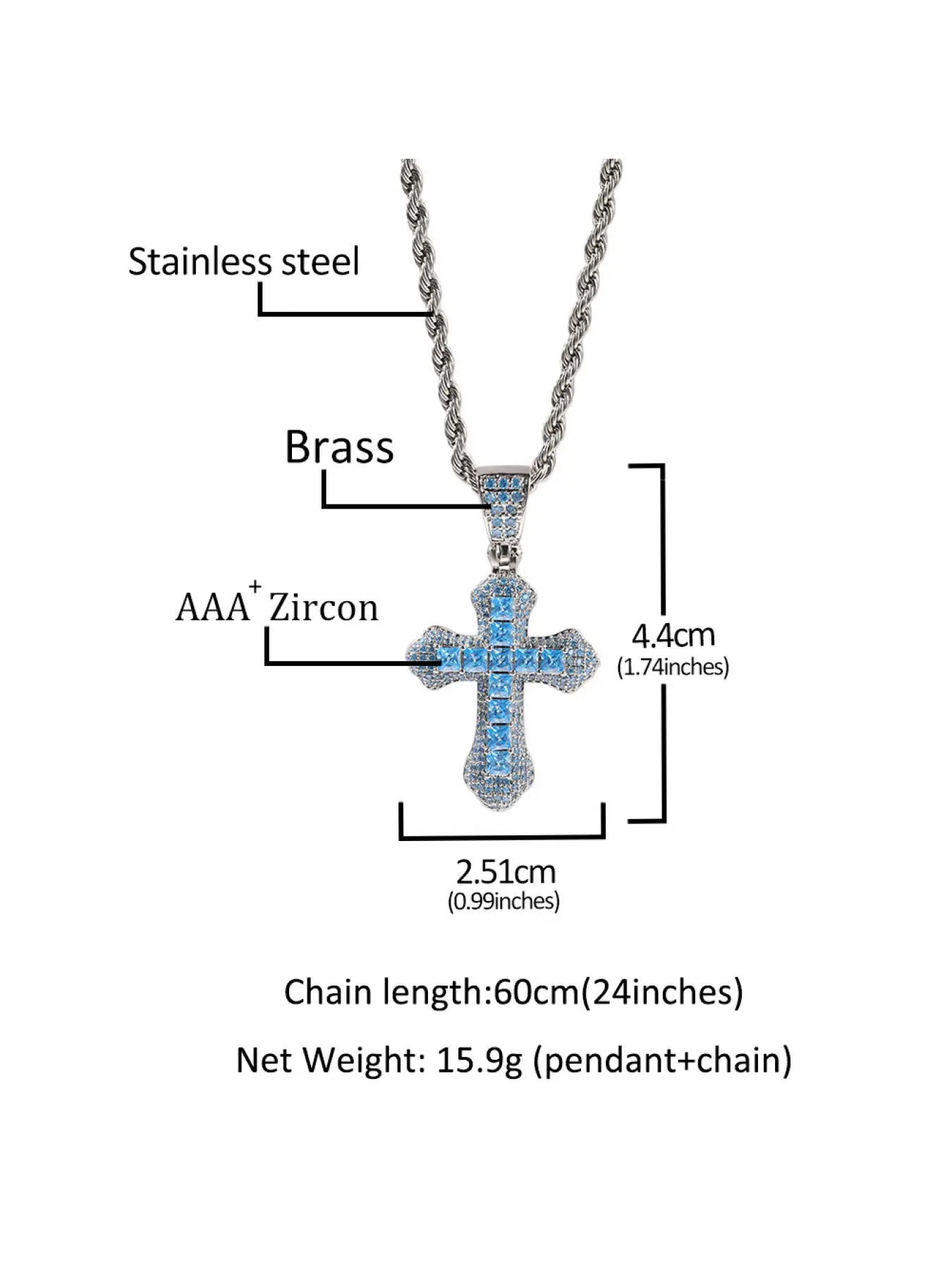 Hip-hop new blue zirconium cross necklace for men, fashionable and versatile heavy-punk sweater chain accessory