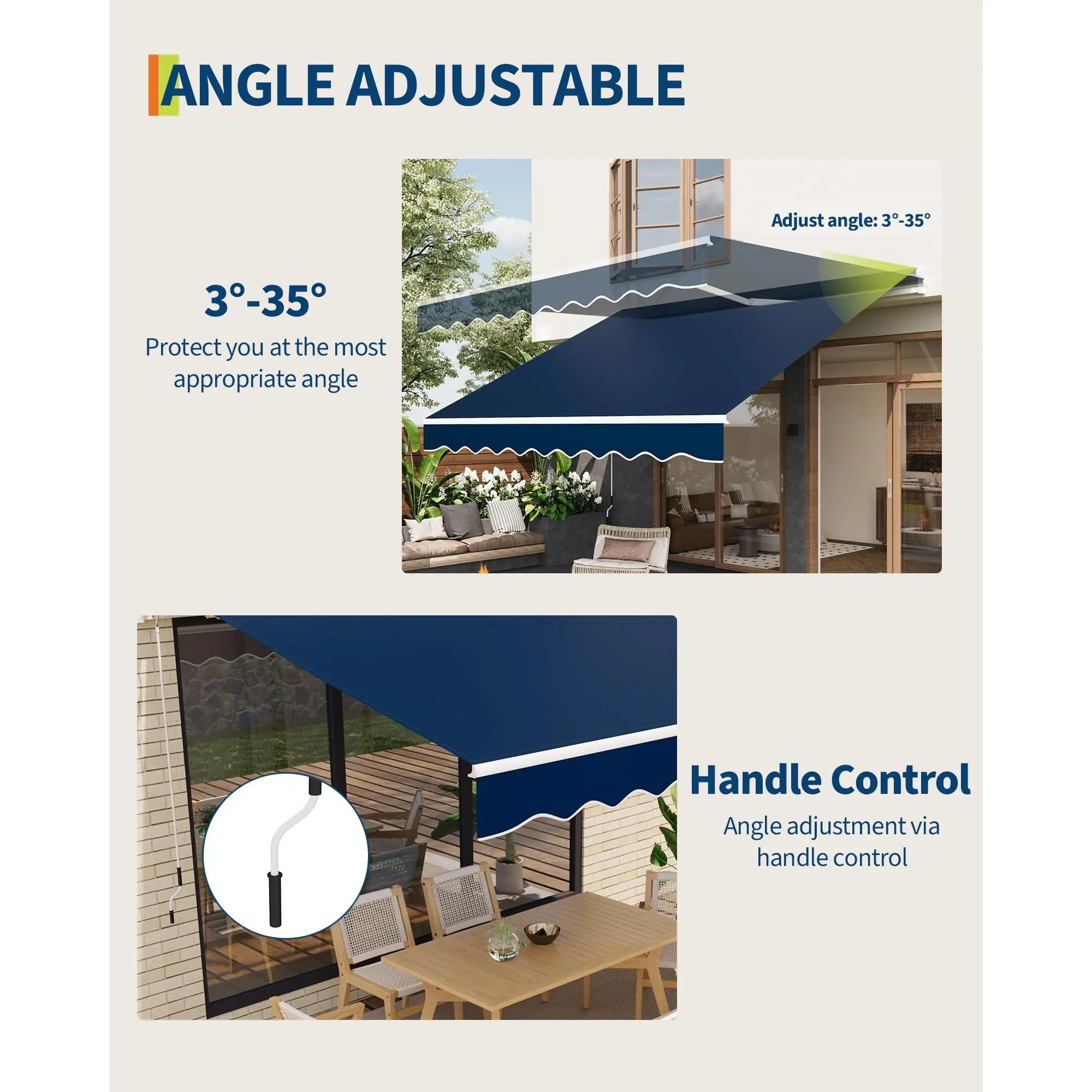 Easy Manual Operation & Flexible Use: Featuring a 5 ft manual awning crank handle, this manual retractable awnings for patio allows smooth 5-35° angle adjustment and effortless roll out or retraction for optimal shade at any time.