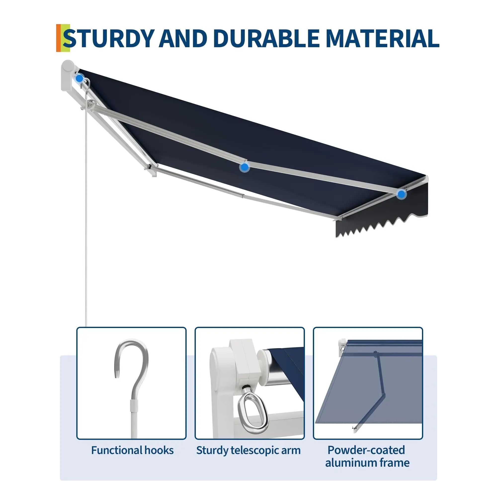 Heavy-Duty Frame for Stability: Featuring a reinforced aluminum frame and double steel wire arms, this retractable awning offers reliable strength and lasting support for your patio or deck in any season.