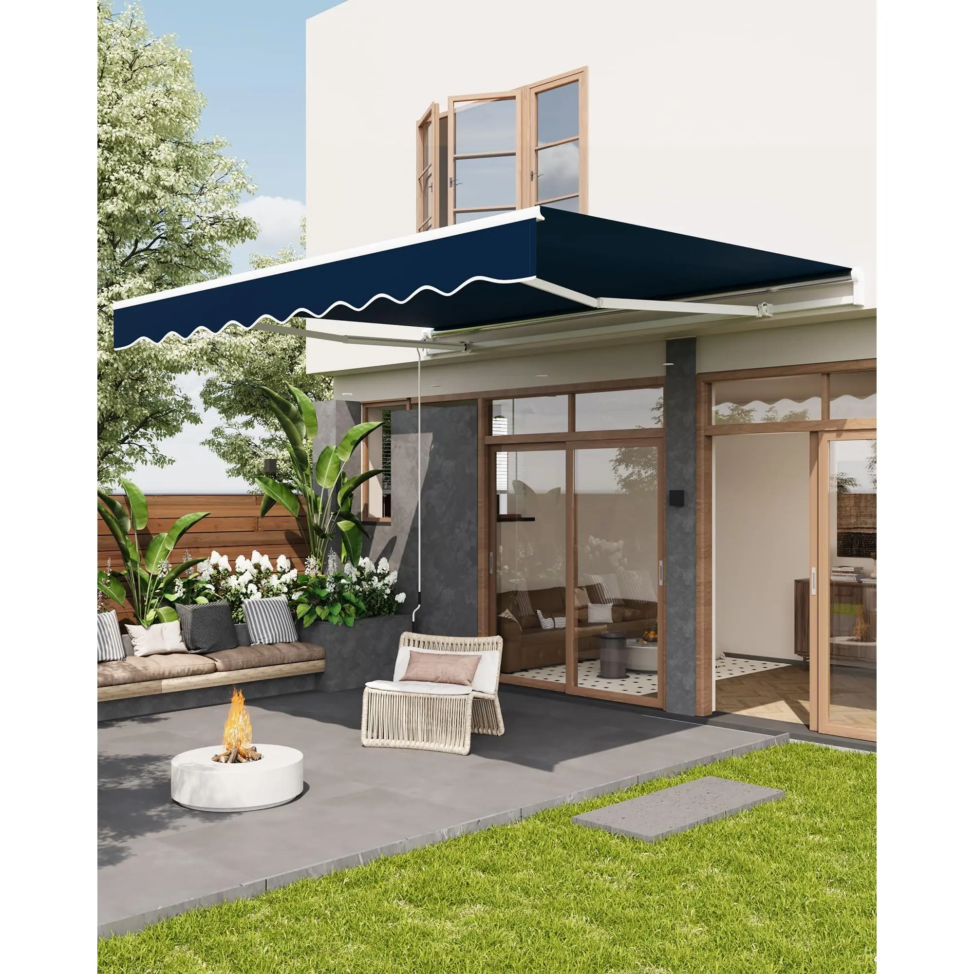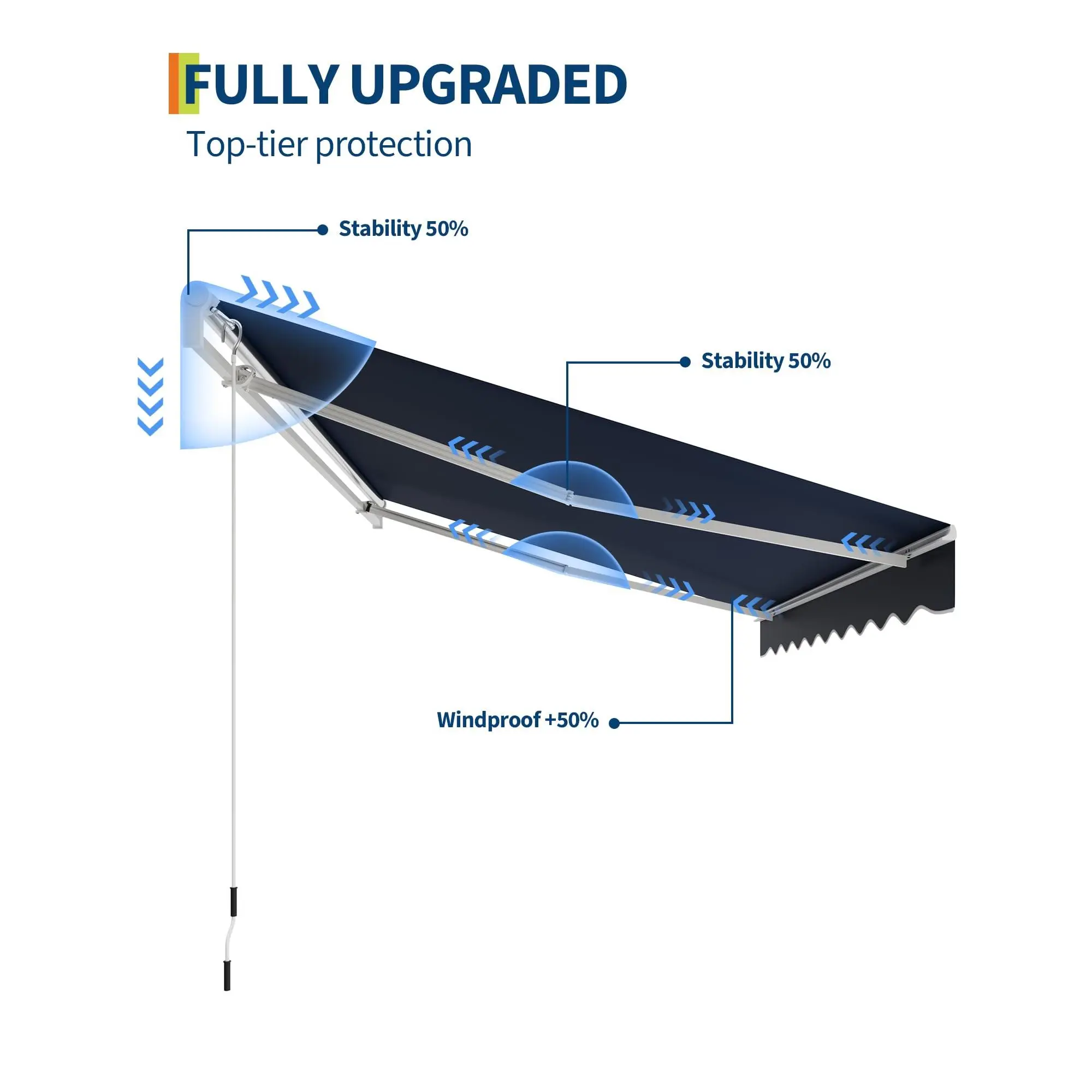 Quick Assembly & Secure Installation: Comes with pre-installed double steel wire arms, corrosion-resistant aluminum hardware, and detailed instructions, reliable installation of your retractable deck awning at home.