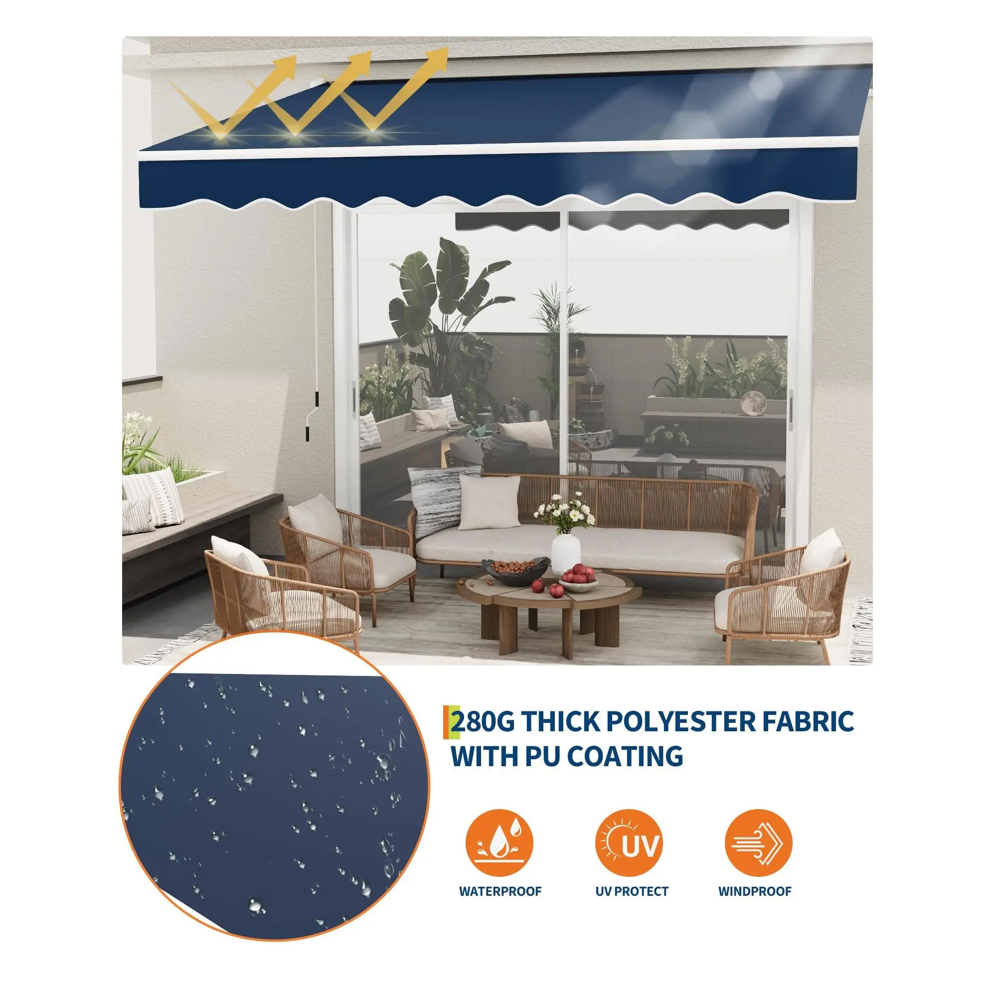 Superior Waterproof & UV Protection: The awning is crafted from 280 g/㎡ polyester fabric with PU coating, providing effective waterproofing and UV50+ sun protection — making it a reliable waterproof retractable awning for your deck or patio.
