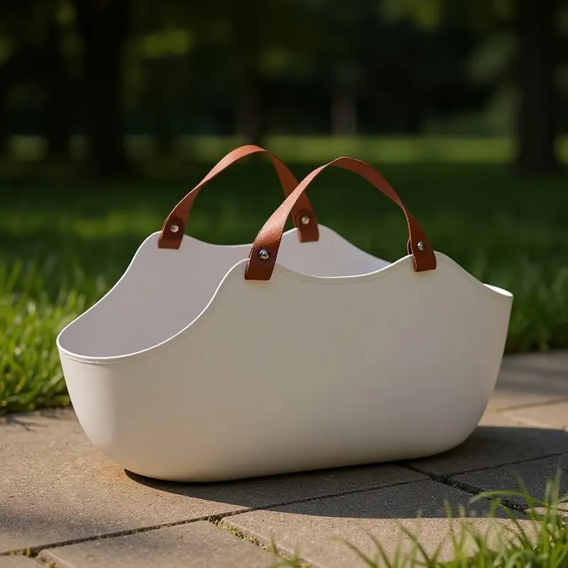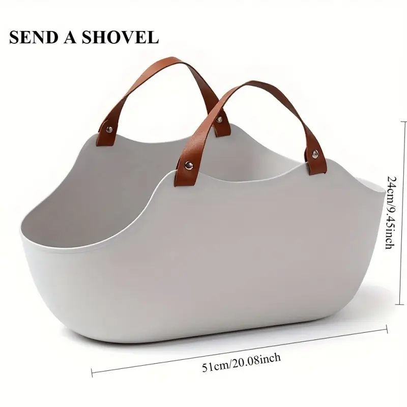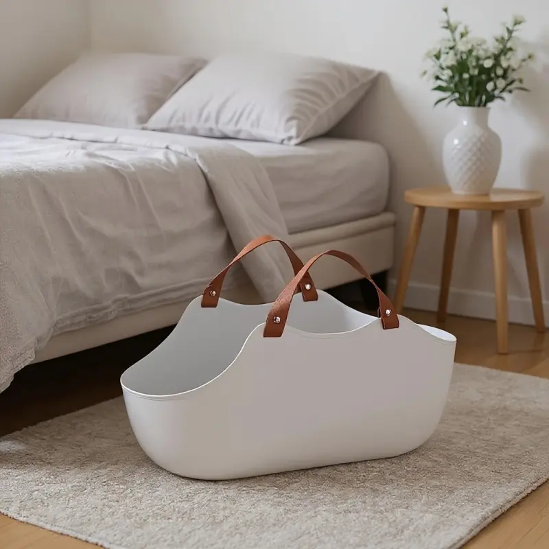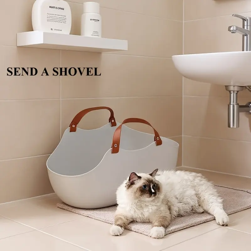 Large Semi-Enclosed Cat Litter Box, Open Front, Anti-Splashing, Portable with Handle, Easy Clean, Modern White & Brown, for Home Travel Apartment