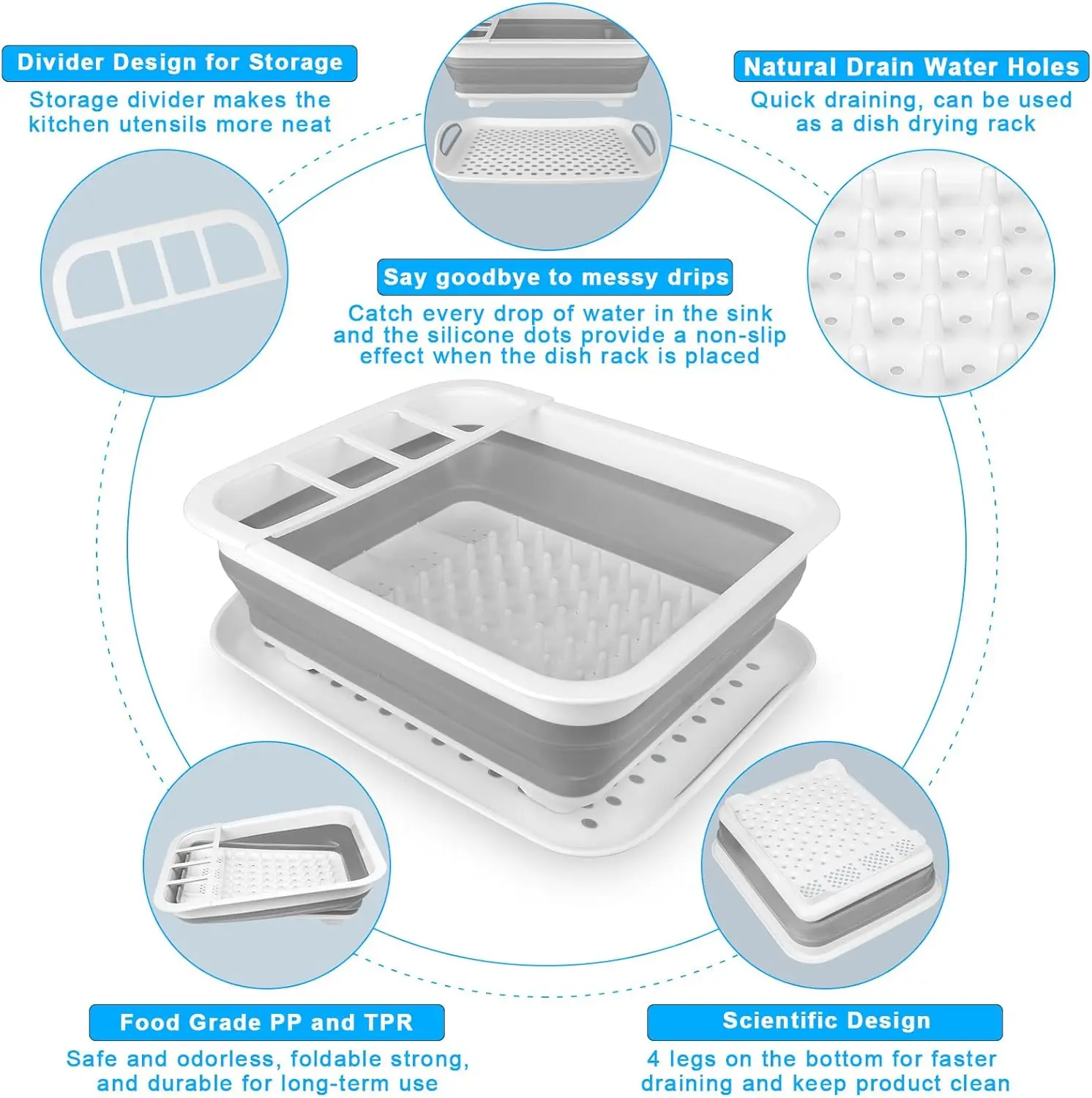 Unfolding size: 14.2 L x 12.4 W x 5.0 H. Holds dishes, pots, pans, and cutlery. Small holes on the bottom ensure easy draining and ventilation. Keeps dishes clean and neat. A must-have for dinnerware and home essentials.