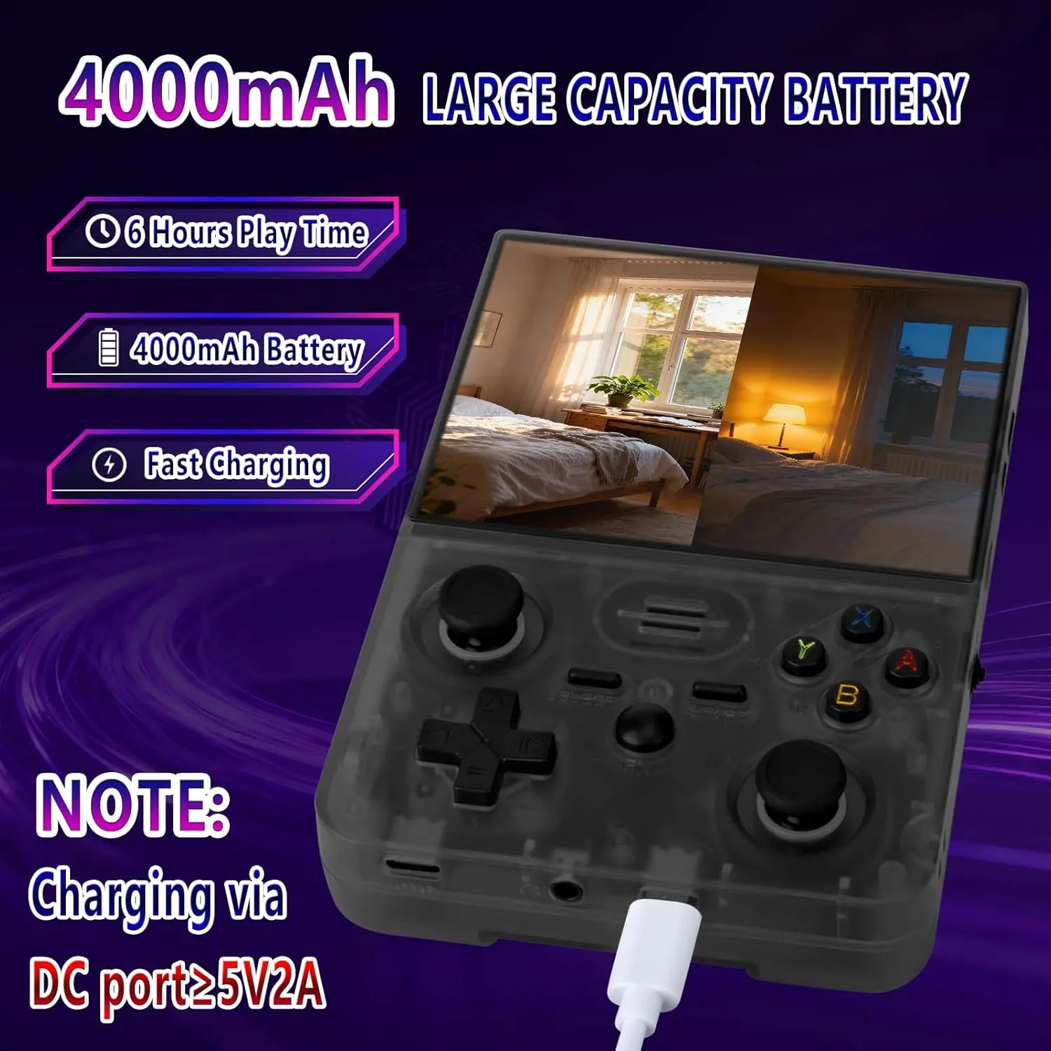 ·Note: 1. For your handheld game console to charge efficiently, we recommend using a charger with an output of at least 5V/2A (10W) or higher. Please ensure that you charge the device through the DC port 2. When you receive your console, the TF card will be inserted inside the game console