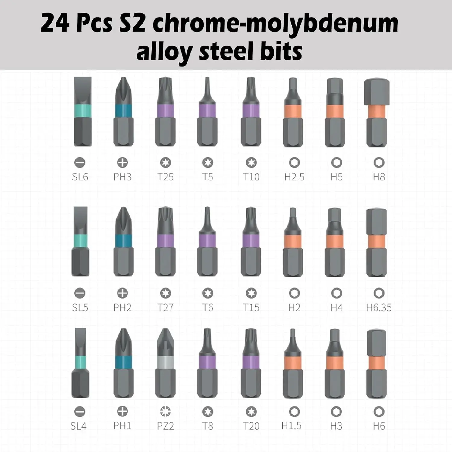 ·24 Premium S2 Steel Bits: With 5 type Bits that includes Phillips, Slotted, Pozidriv, Torx, and Hex magnetic bits (1/4"/6.35mm). Made of durable chrome-molybdenum alloy steel for professional repairs on electronics, furniture, and bicycles.